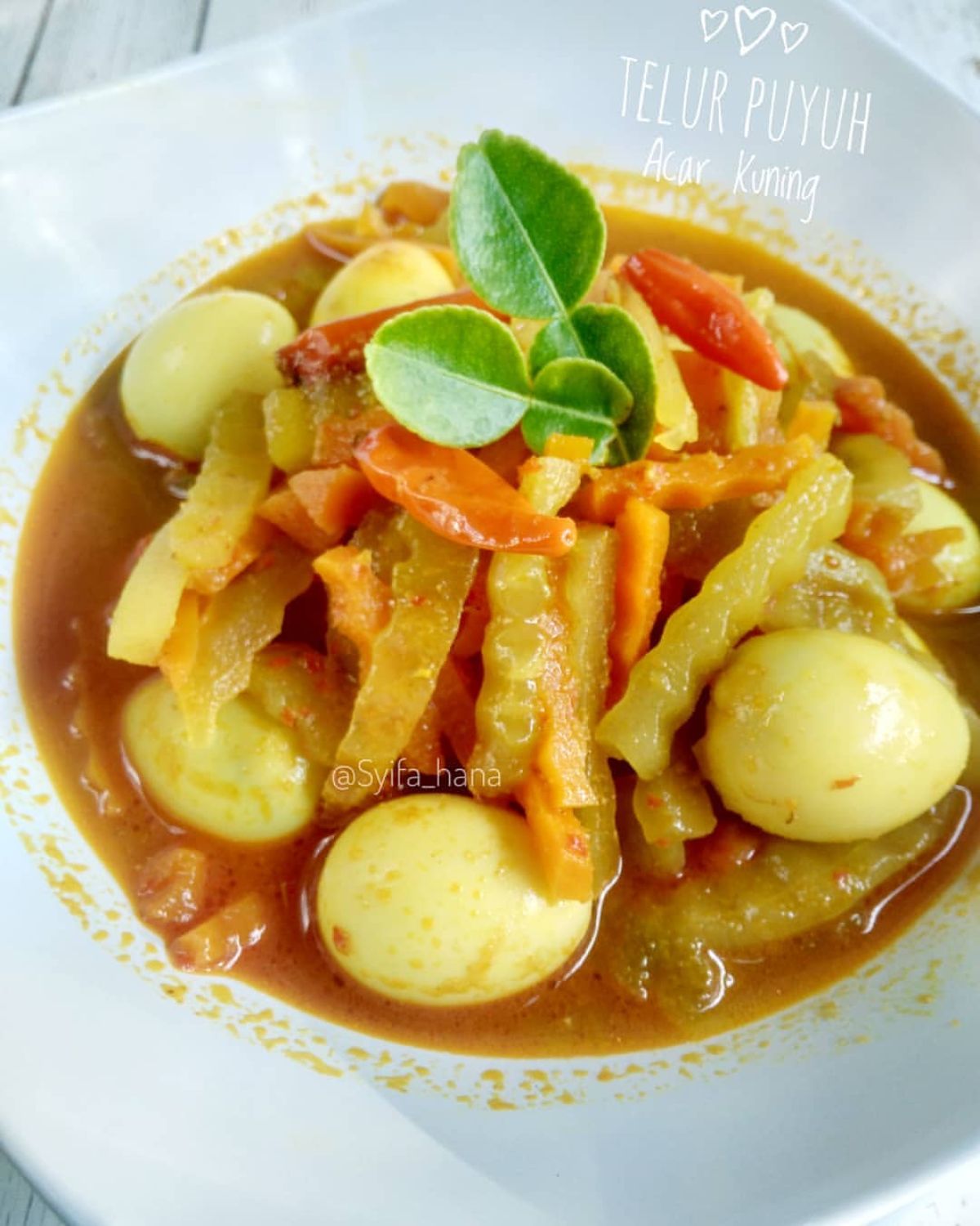 Telur puyuh acar kuning ini merupakan salah satu masakan khas Indonesia yang sering disajikan saat berbuka puasa. Telur puyuh terkenal enak dan berprotein tinggi. Makanan ini biasanya dipadukan dengan acar yang segar dan pedas, memberikan pengalaman rasa yang kaya.