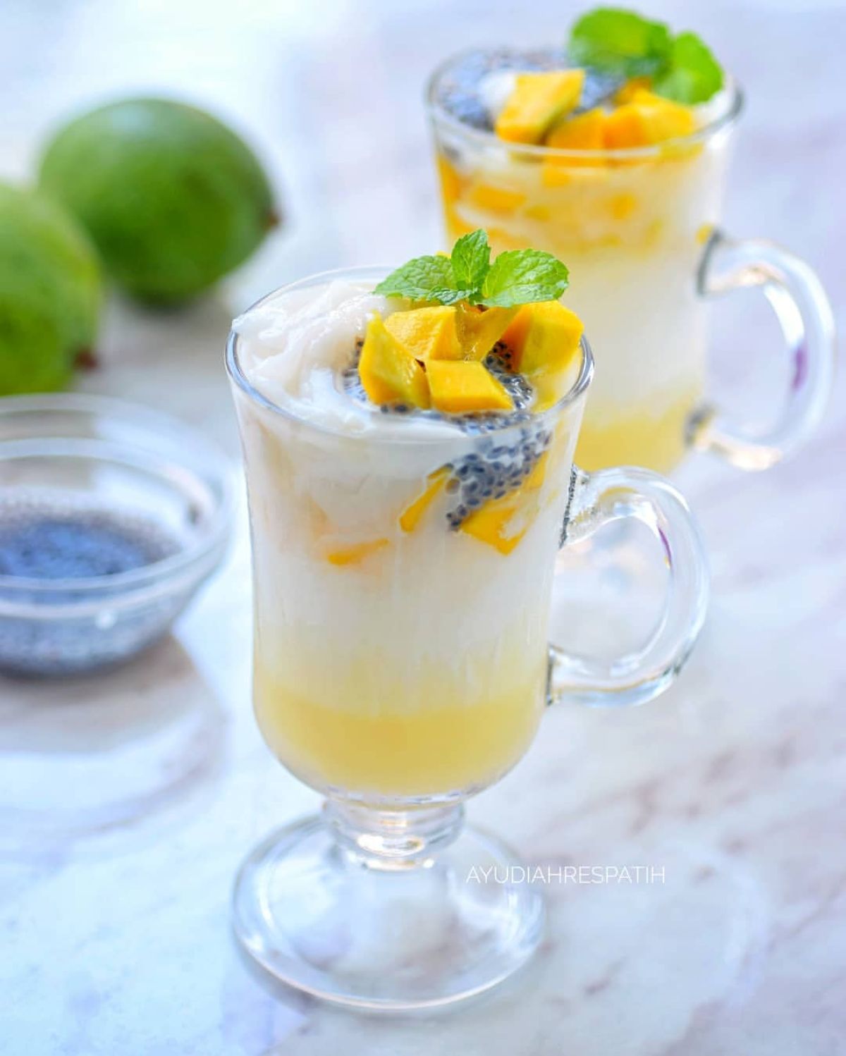 - Tambahkan potongan kweni ke dalam gelas. Kweni adalah jenis mangga yang punya rasa manis dan segar.