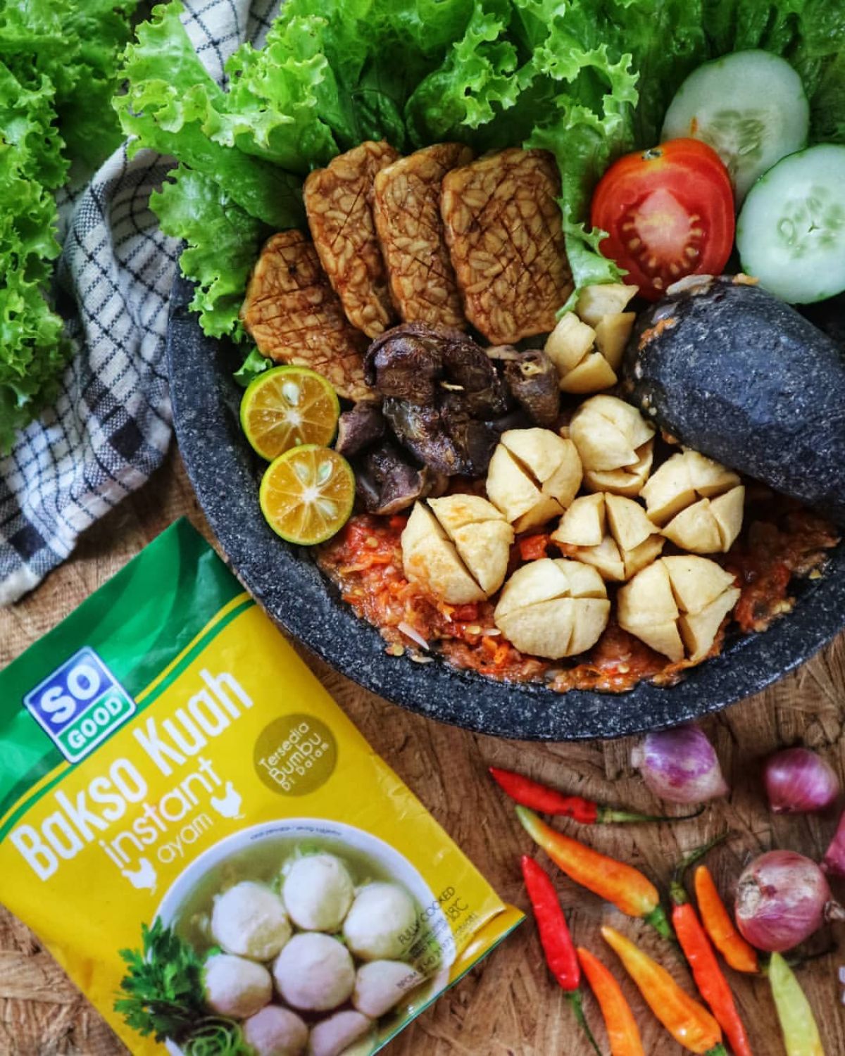 Setelah semua komponen siap, tata bakso, tempe, dan ati ampela di atas sambal korek. Kamu juga bisa memenyetnya untuk rasa yang lebih mantap. Sajikan bersama lalapan segar!