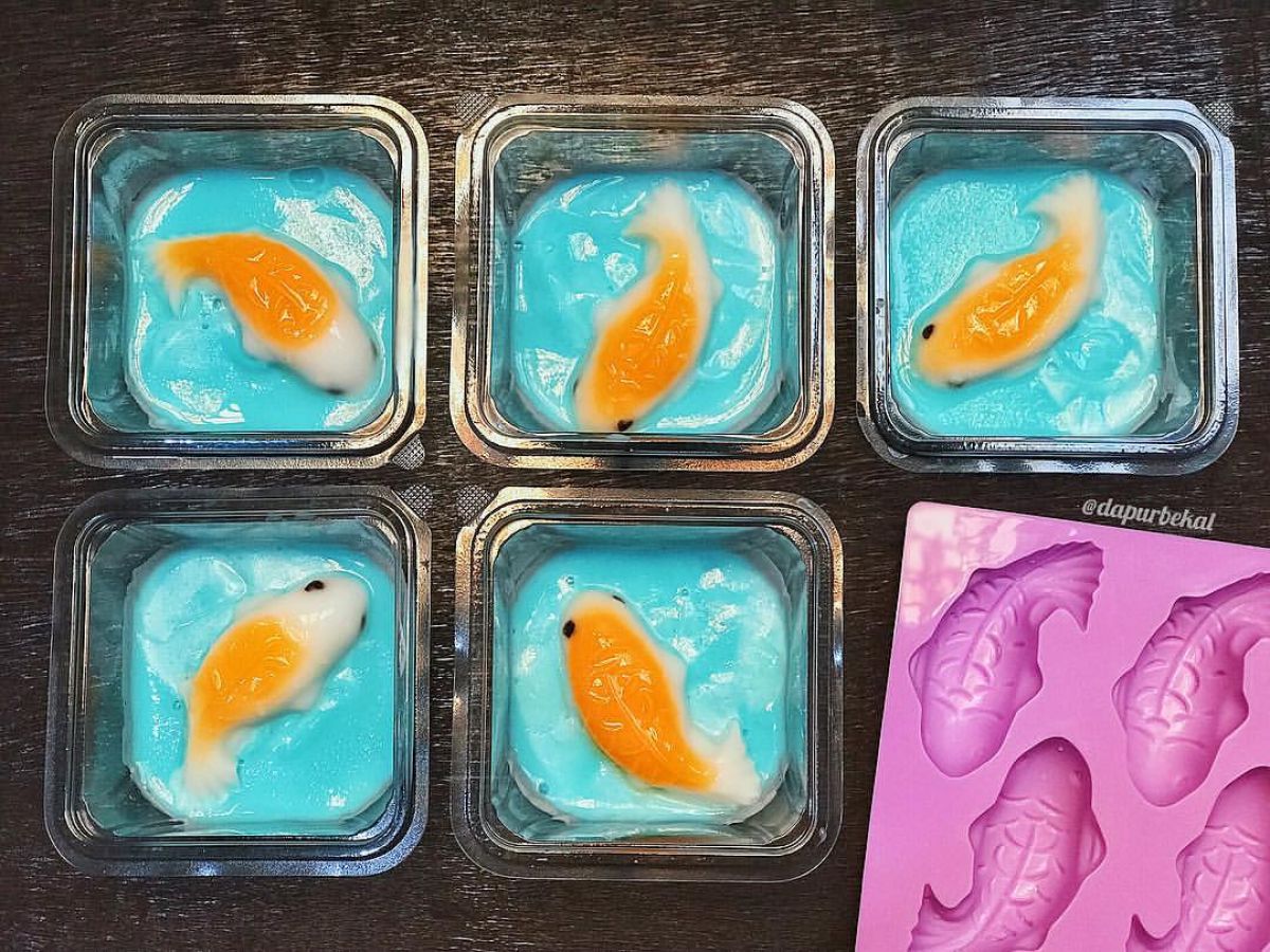 - Setelah semua puding mengeras, masukkan ke dalam kulkas agar lebih dingin. Setelah benar-benar mengeras, sajikan pudding biru sebagai dasar dan atur pudding ikan di atasnya.