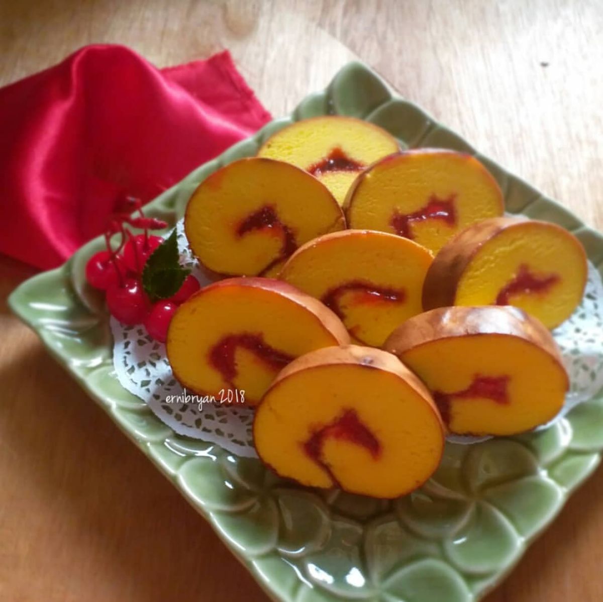 - Setelah matang, keluarkan dari loyang dan olesi permukaannya dengan selai strawberry. Kemudian gulung kue perlahan.