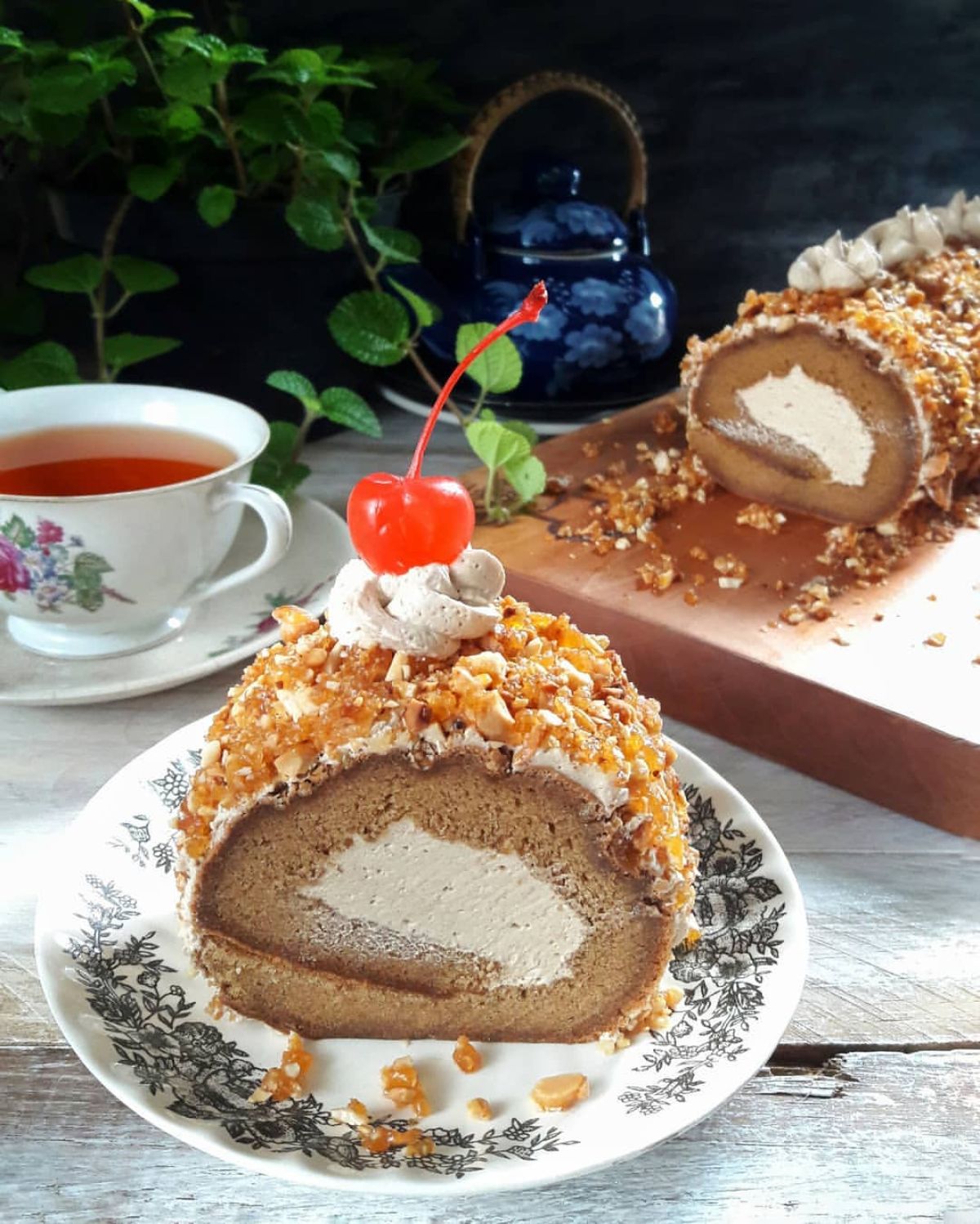 Setelah kue set, tambahkan topping nougat di atasnya. Kemudian, potong-potong dan sajikan. Nikmati kue gulung mocca nougat ini bersama teman atau keluarga!