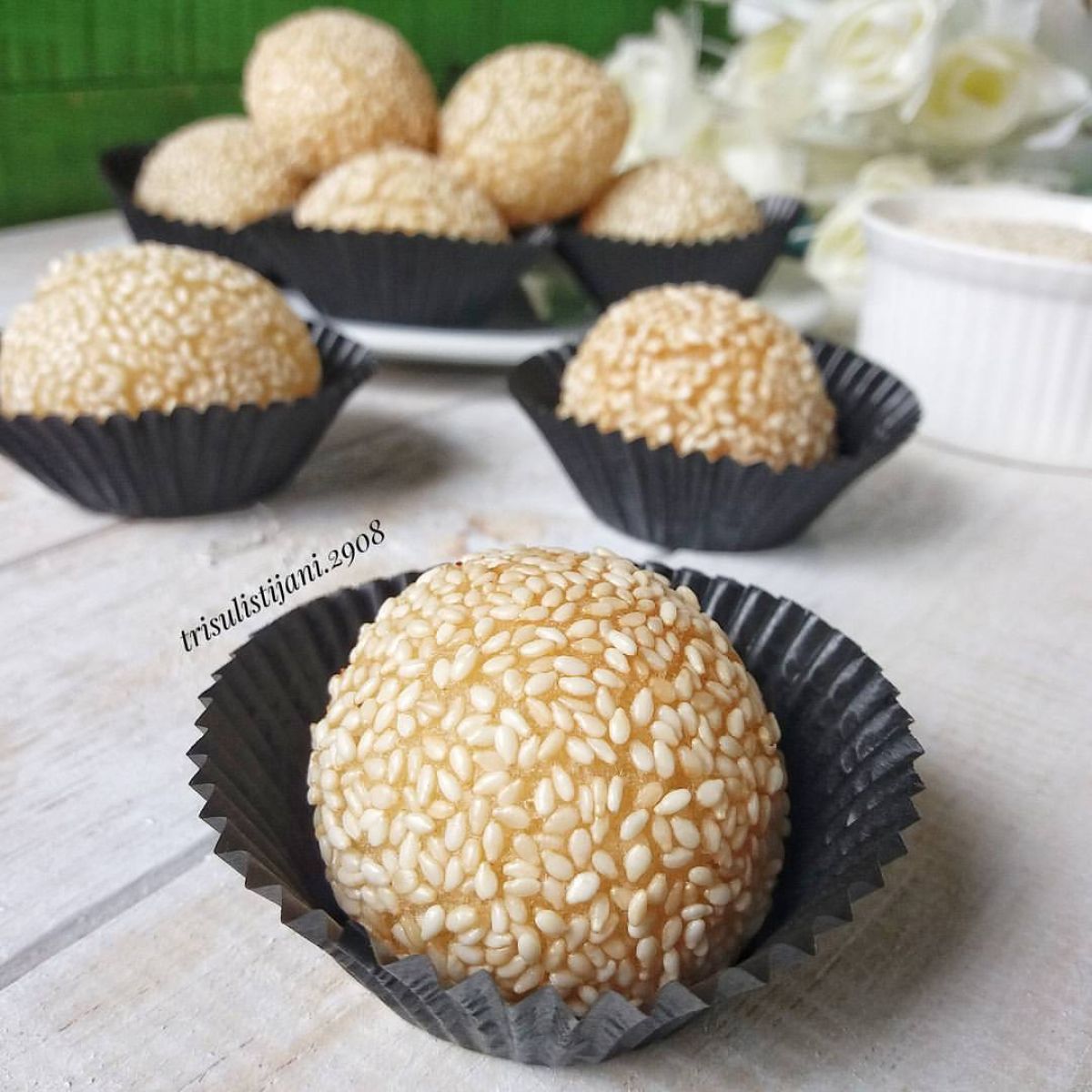 7. Celupkan bulatan ke dalam air sedikit, lalu gulingkan ke biji wijen, tekan-tekan sedikit agar wijen menempel.