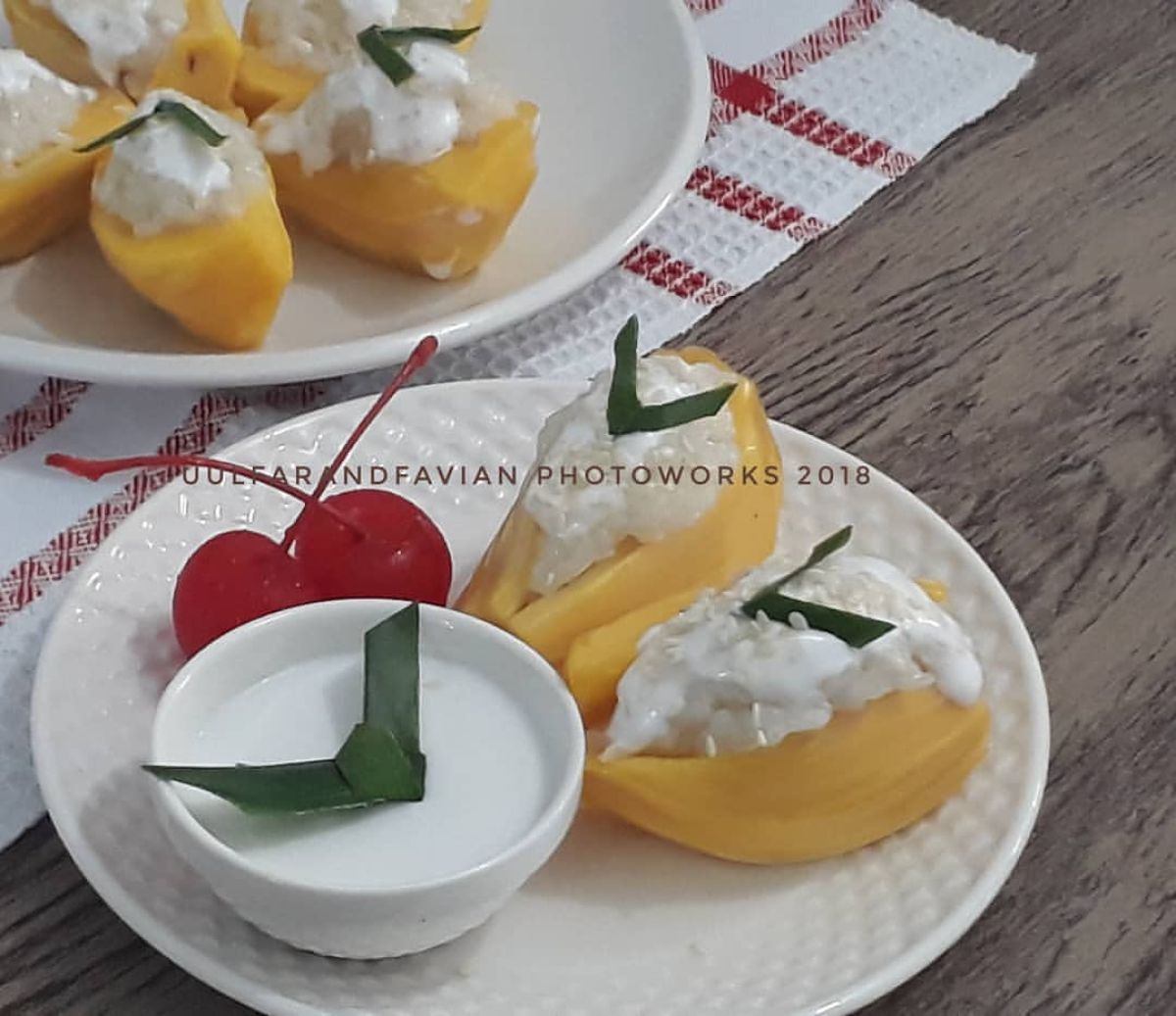 - Untuk penyelesaian, masukkan ketan ke dalam potongan nangka yang telah dibuang bijinya. Siram saus santan di atasnya dan taburi dengan wijen sangrai. Hidangkan dengan hangat.