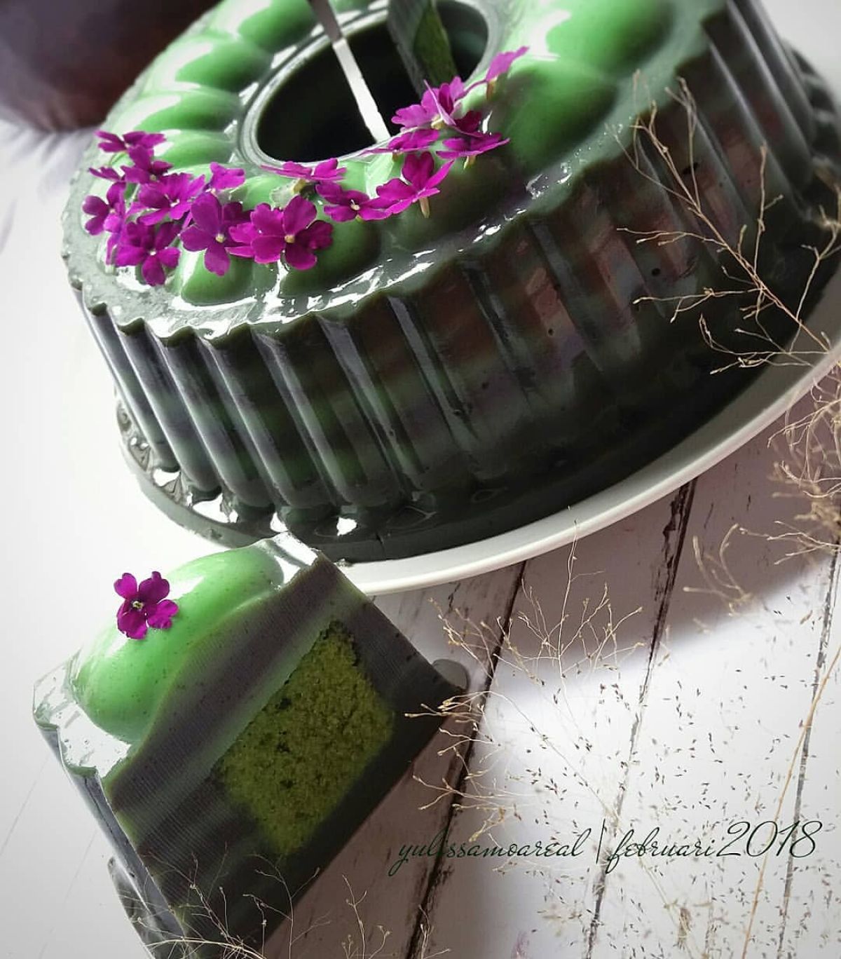 7. Letakkan green tea cake di atas lapisan ketiga yang telah dimasak. Ambil 6 sendok sayur bahan puding hijau dan masak hingga mendidih, tuang perlahan di atas cake menggunakan sendok kecil.