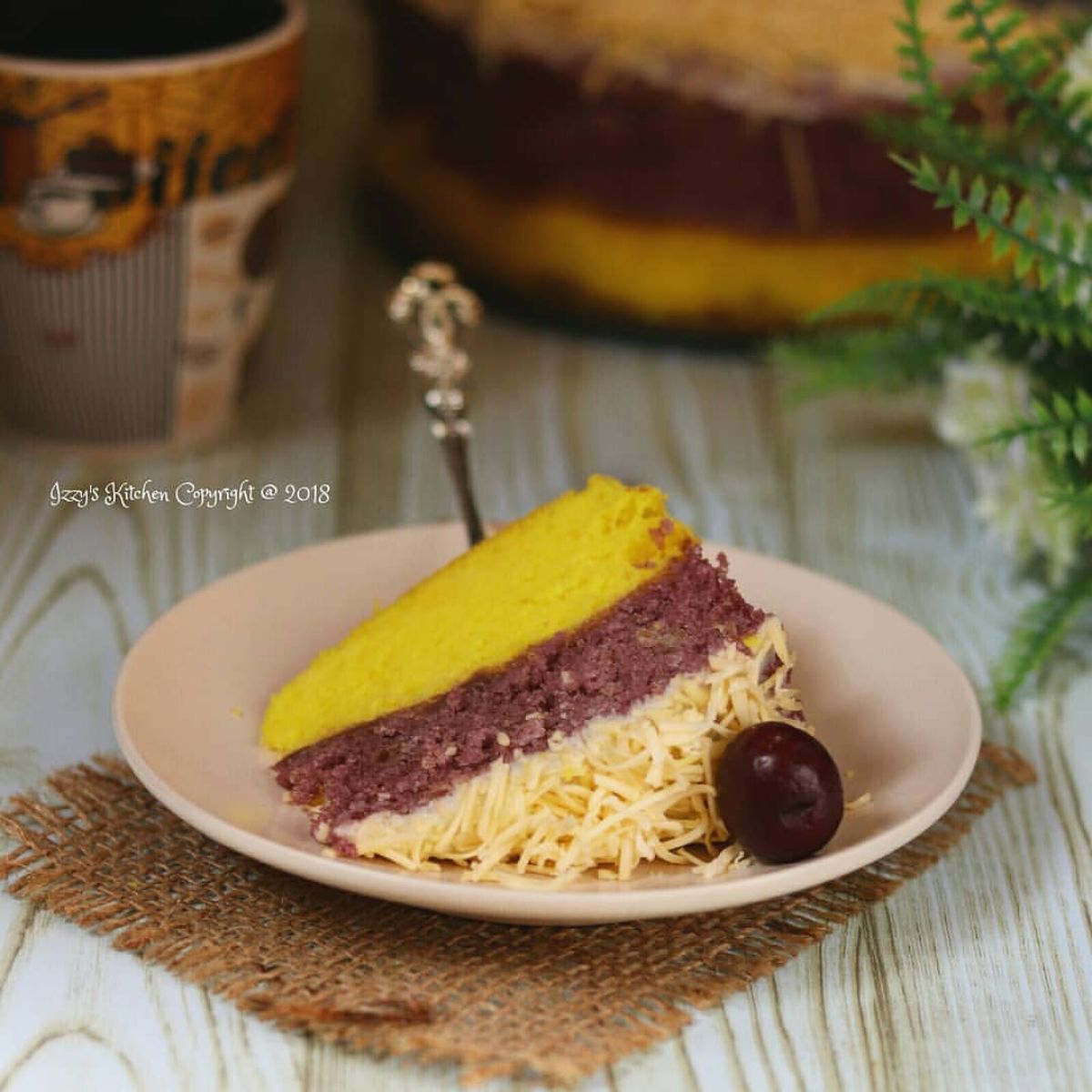 - Tuang lapisan taro di atas lapisan tape, kukus lagi selama 20 menit. Angkat dan dinginkan.