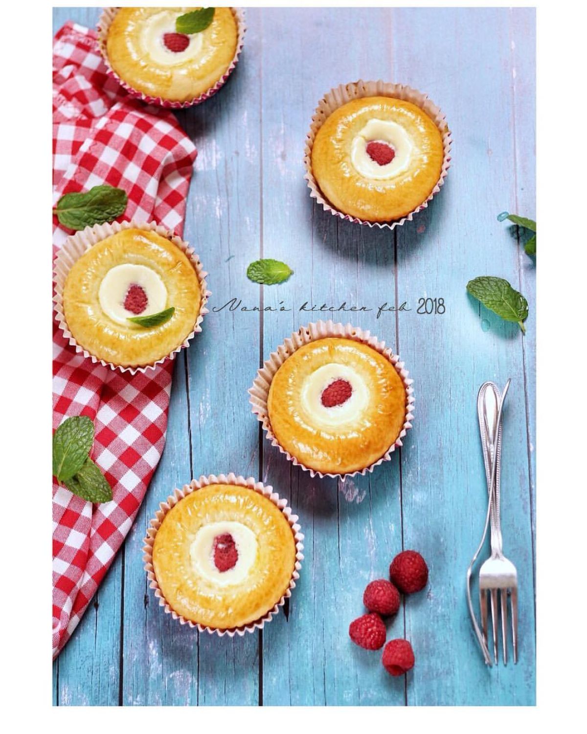 Oleskan bahan olesan di bagian roti yang tidak ditekan. Panaskan oven pada suhu 190 derajat Celsius. Panggang roti selama 8-10 menit, kemudian keluarkan dan angkat loyang muffin. Isi roti dengan filling yang sudah dibuat. Tata buah raspberry di atasnya dan panggang kembali pada suhu 150 derajat Celsius selama kurang lebih 10 menit hingga matang dan kecokelatan.