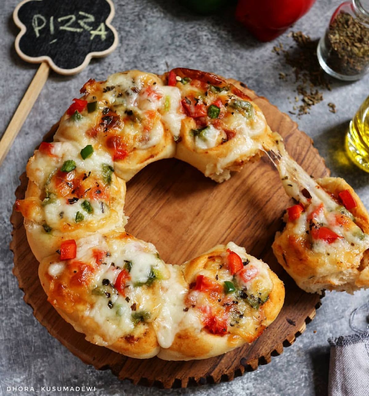 - Taburi bagian atas Pizza Roll dengan potongan paprika, keju mozzarella, dan oregano untuk menambah rasa dan tampilannya.