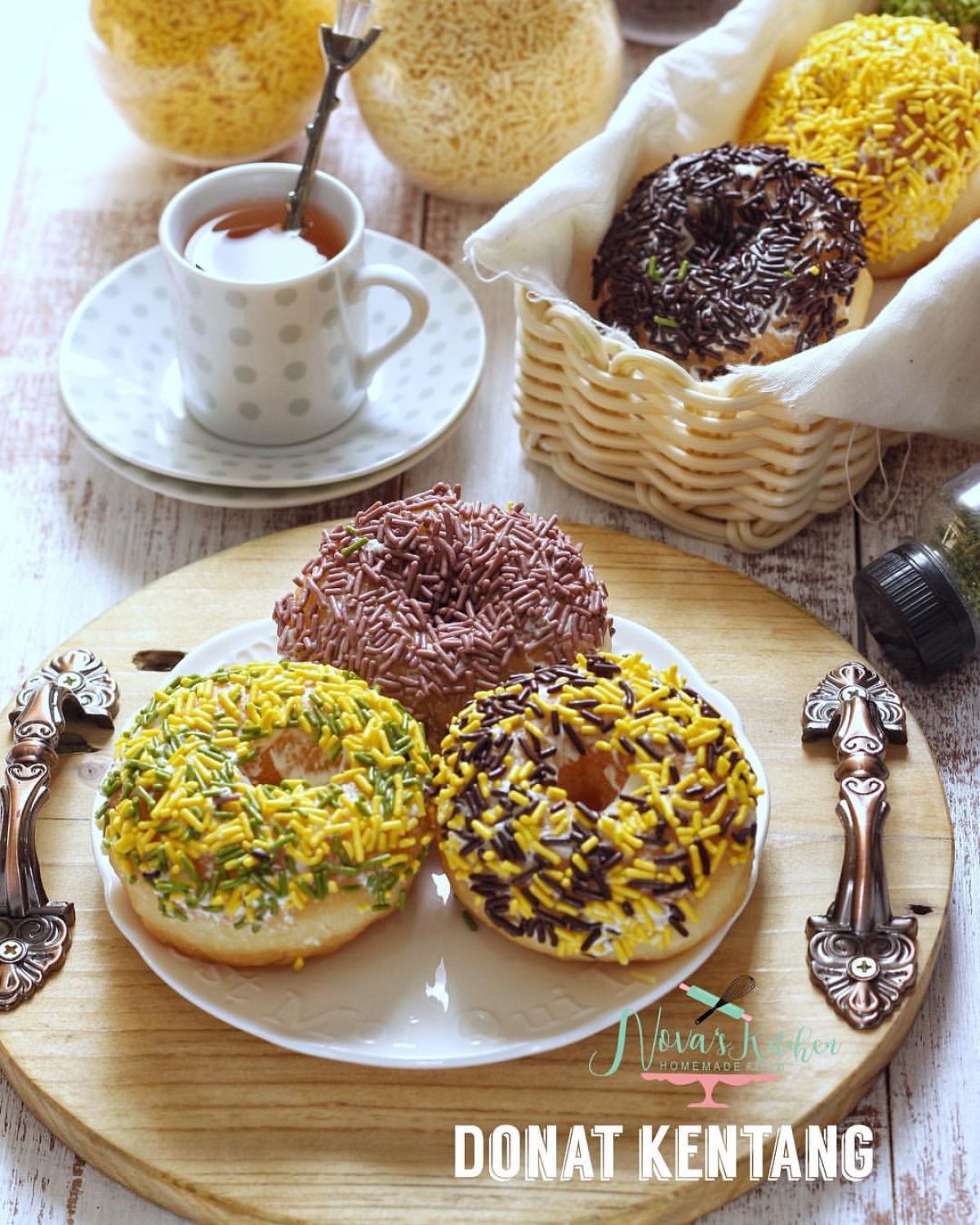 Donat kentang adalah salah satu variasi donat yang populer di Indonesia. Rasanya yang lembut dan sedikit manis membuatnya sangat digemari, terutama oleh anak-anak. Selain itu, tampilannya yang cantik dengan meises warna-warni membuat donat ini semakin menarik. Meises adalah taburan cokelat kecil yang biasa digunakan sebagai topping pada berbagai kue dan makanan penutup. Donat kentang bisa menjadi pilihan yang praktis dan menyenangkan untuk sarapan atau acara keluarga.