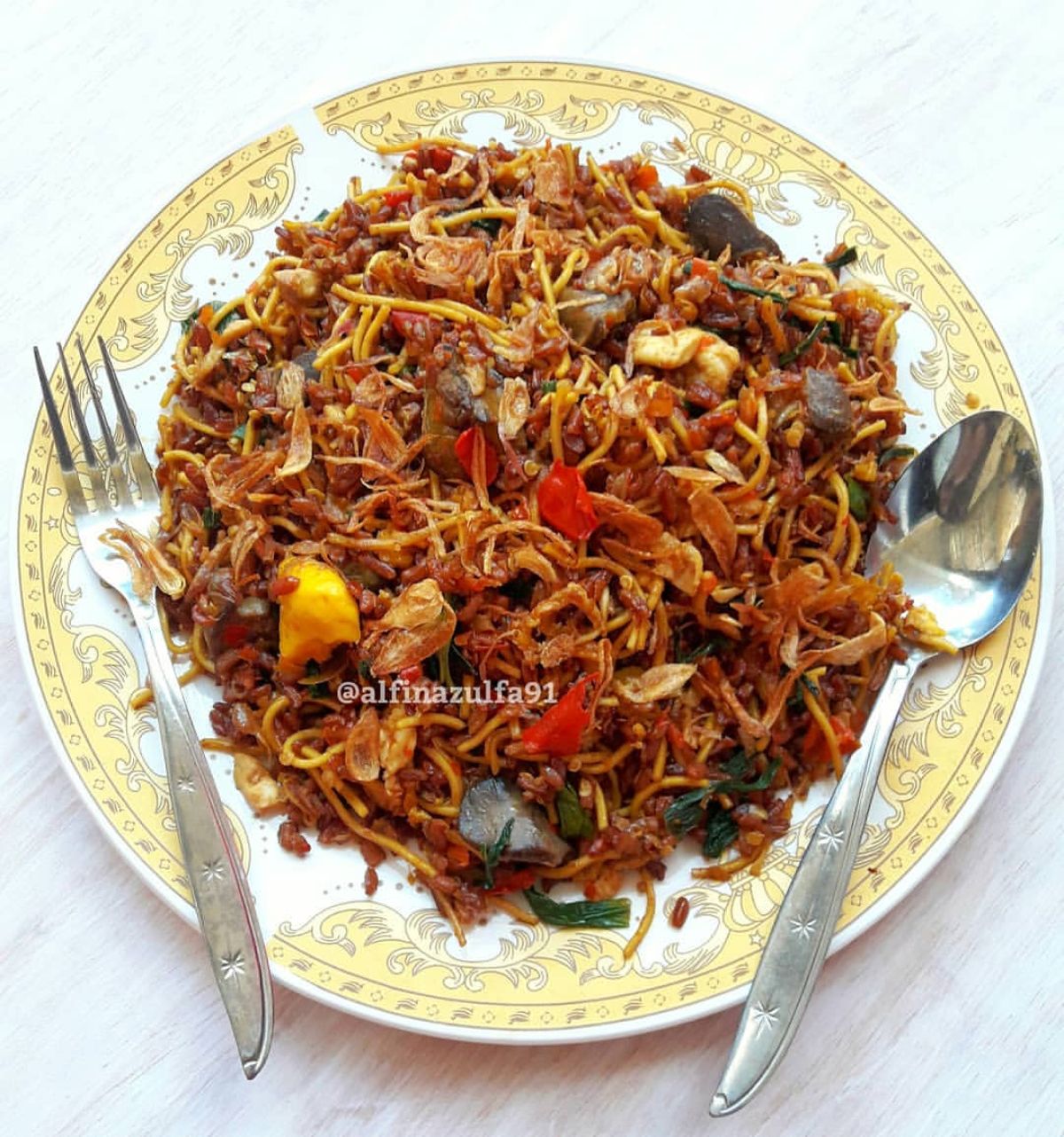 - Selanjutnya, masukkan nasi merah dan mie kuning, aduk-aduk hingga semua bahan tercampur rata.