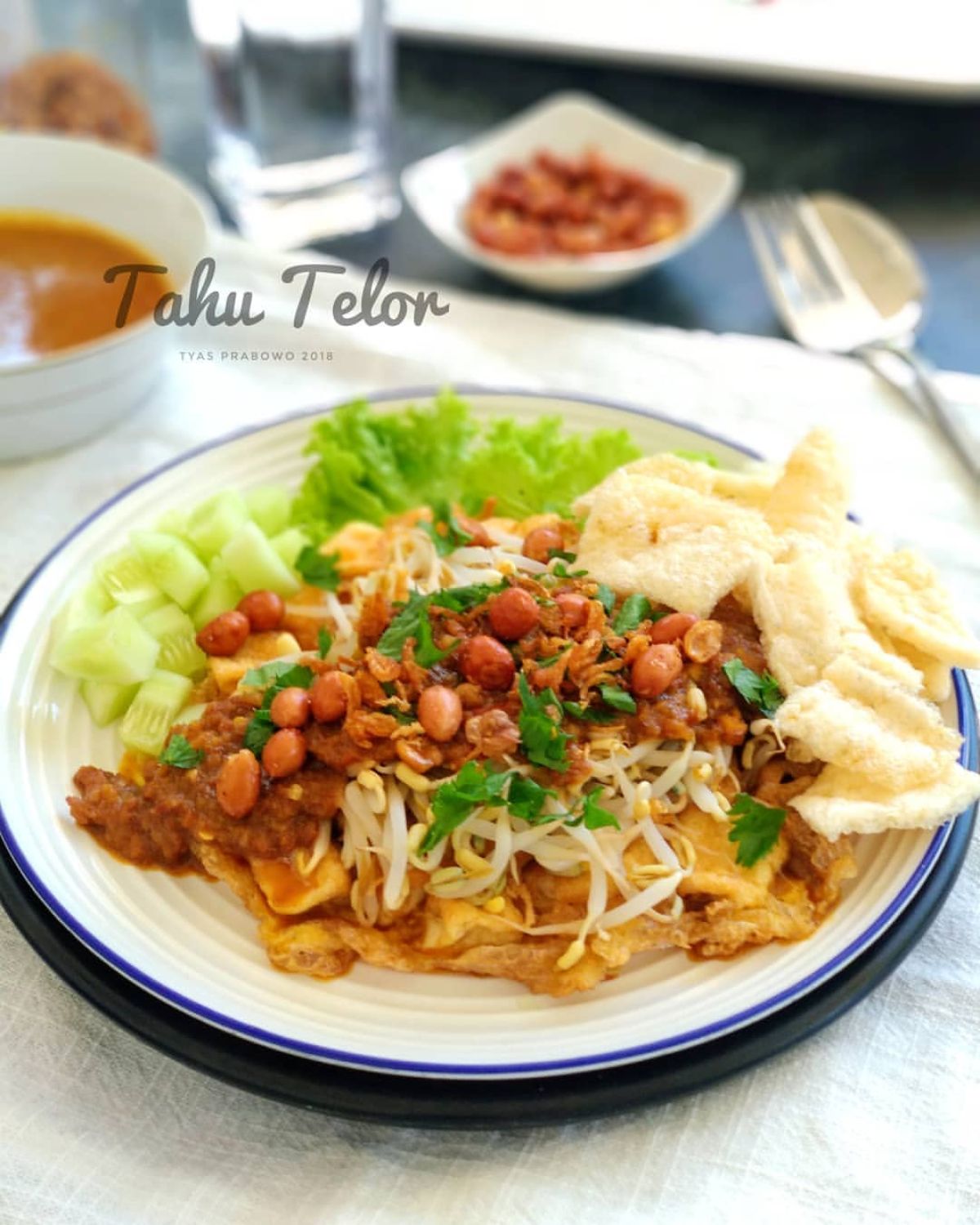 - Siapkan piring saji, tata tahu telur yang sudah digoreng di atasnya. Tambahkan taoge, kemudian siram dengan bumbu kacang di atasnya.