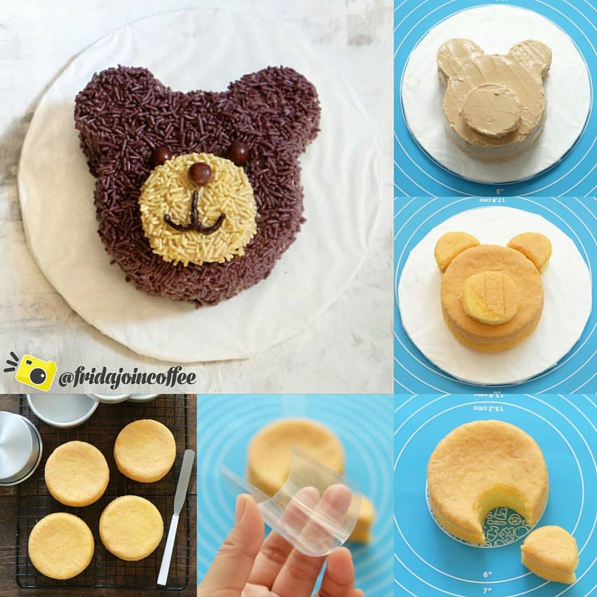 - Dengan bantuan cookie cutter atau mika yang dipotong, buatlah kuping beruang dari sponge cake yang telah dipanggang.