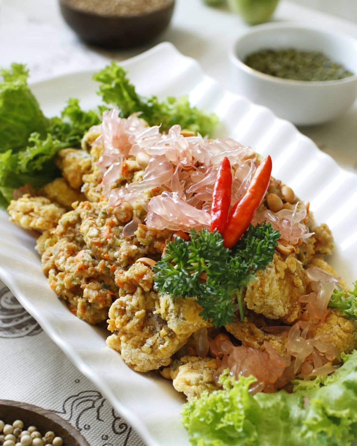6. Terakhir, taburi dengan sisa kacang tanah dan jeruk bali, lalu hidangkan bersama selada untuk tampilan yang lebih menarik.