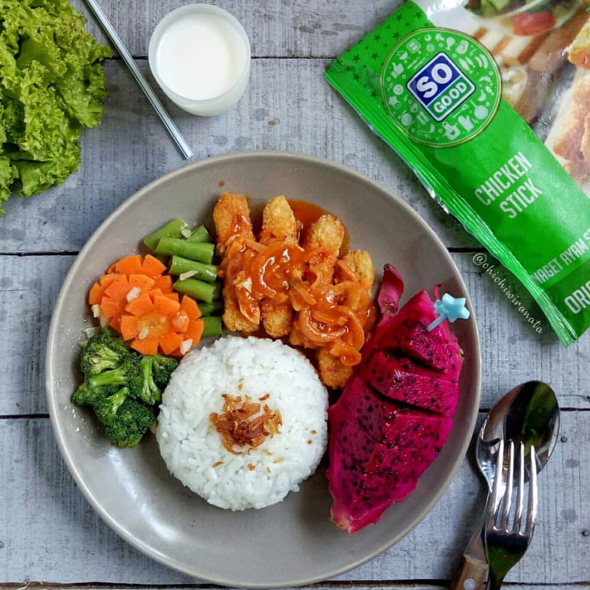 Setelah semua bahan siap, ambil piring dan susun dengan rapi: nasi di sebelah satu, tumis sayur di sebelahnya, buah naga di tengah, dan chicken stick di atasnya. Ini bukan hanya cantik, tapi juga menggugah selera!