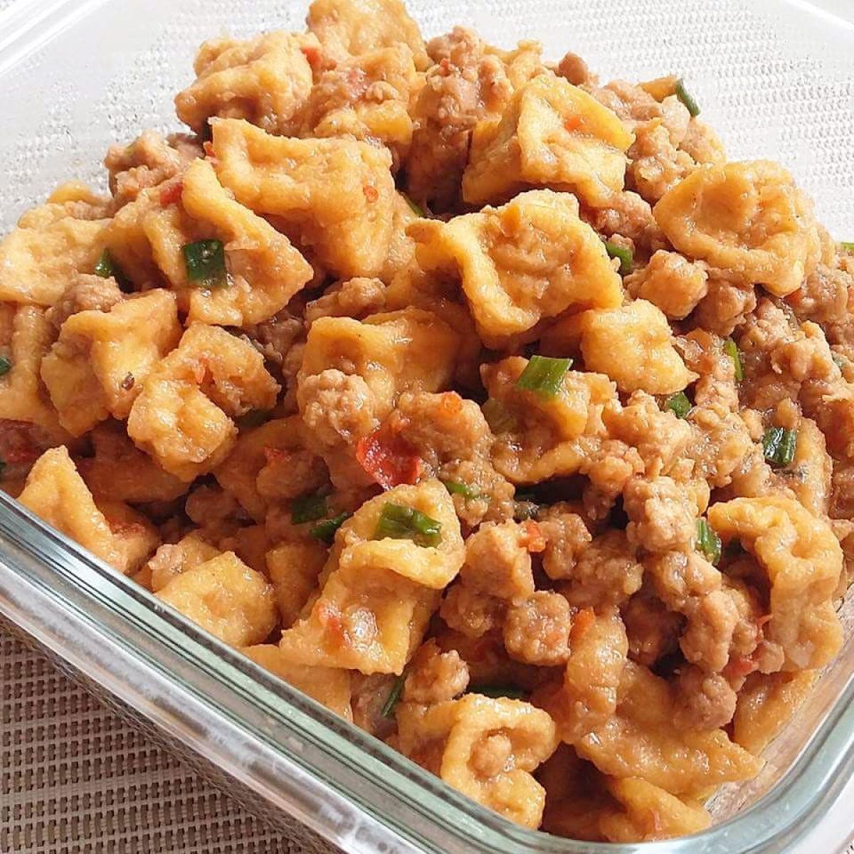 - Tambahkan tahu goreng dan taoco, lalu beri sedikit air secukupnya agar tidak terlalu kering.