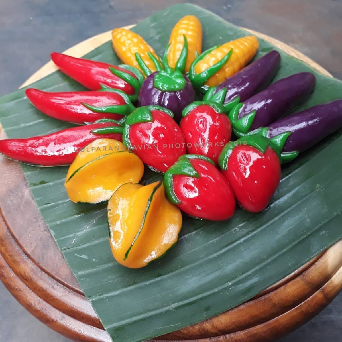- Pewarna: Beri warna adonan kulit sesuai selera. Misalnya, merah untuk strawberry dan cabe, ungu untuk terong, kuning untuk jagung dan belimbing, serta hijau untuk daunnya.