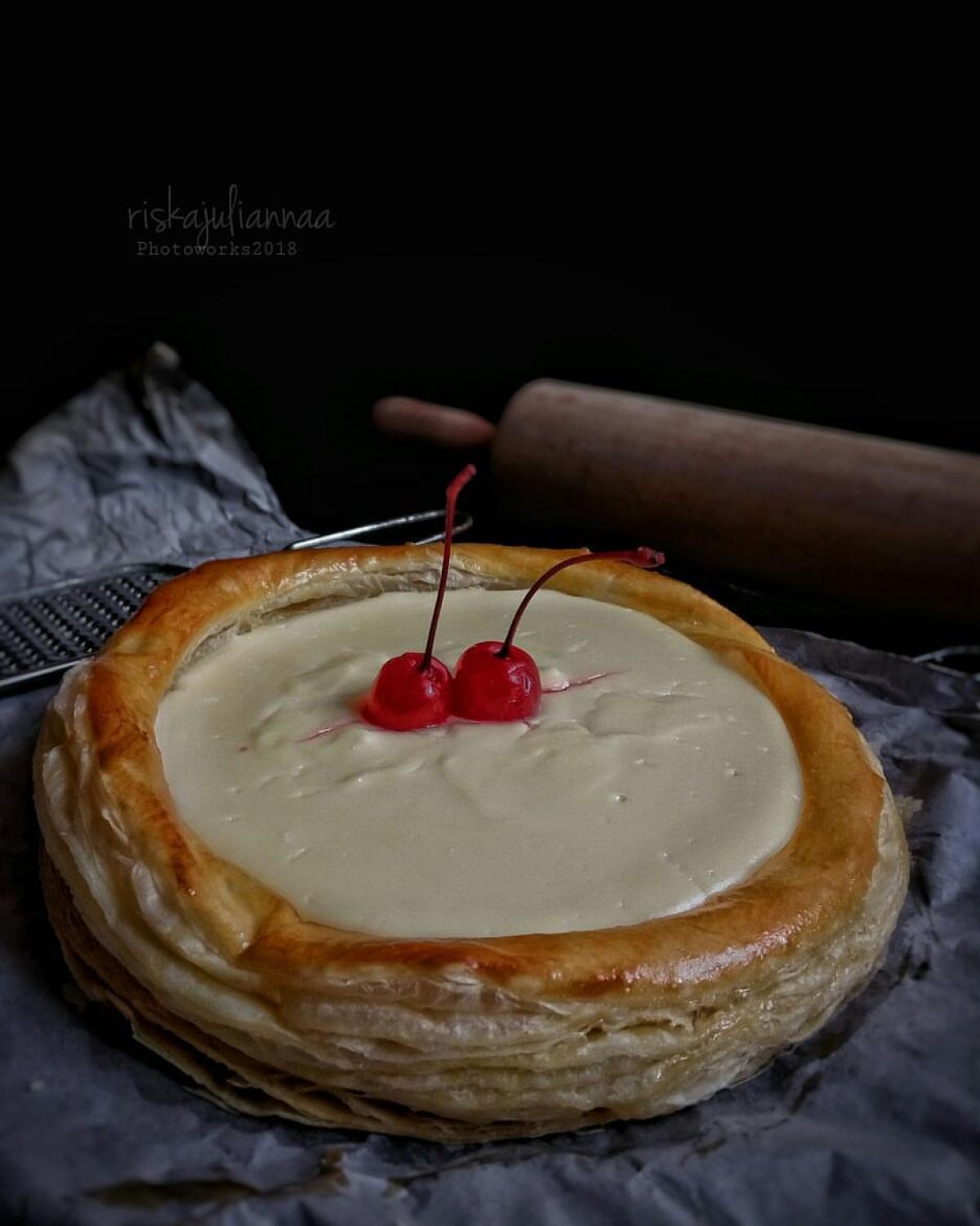 Potong bulat kulit puff pastry dengan diameter sekitar 18 cm. Pastikan kamu menaruhnya di loyang yang sudah dialasi dengan kertas roti agar tidak lengket.
