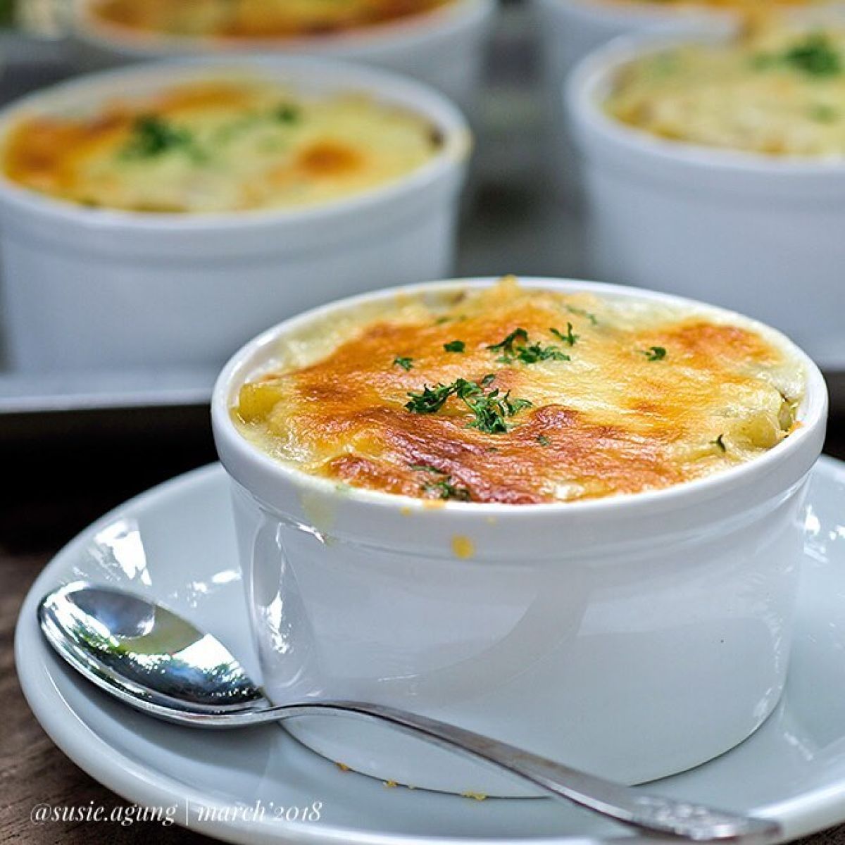 - Setelah campuran agak hangat, masukkan kocokan telur sambil diaduk cepat. Jika kamu suka, taburi oregano atau parsley untuk sedikit rasa dan aroma. Tuang campuran ini ke dalam ramekin atau cup alumunium.