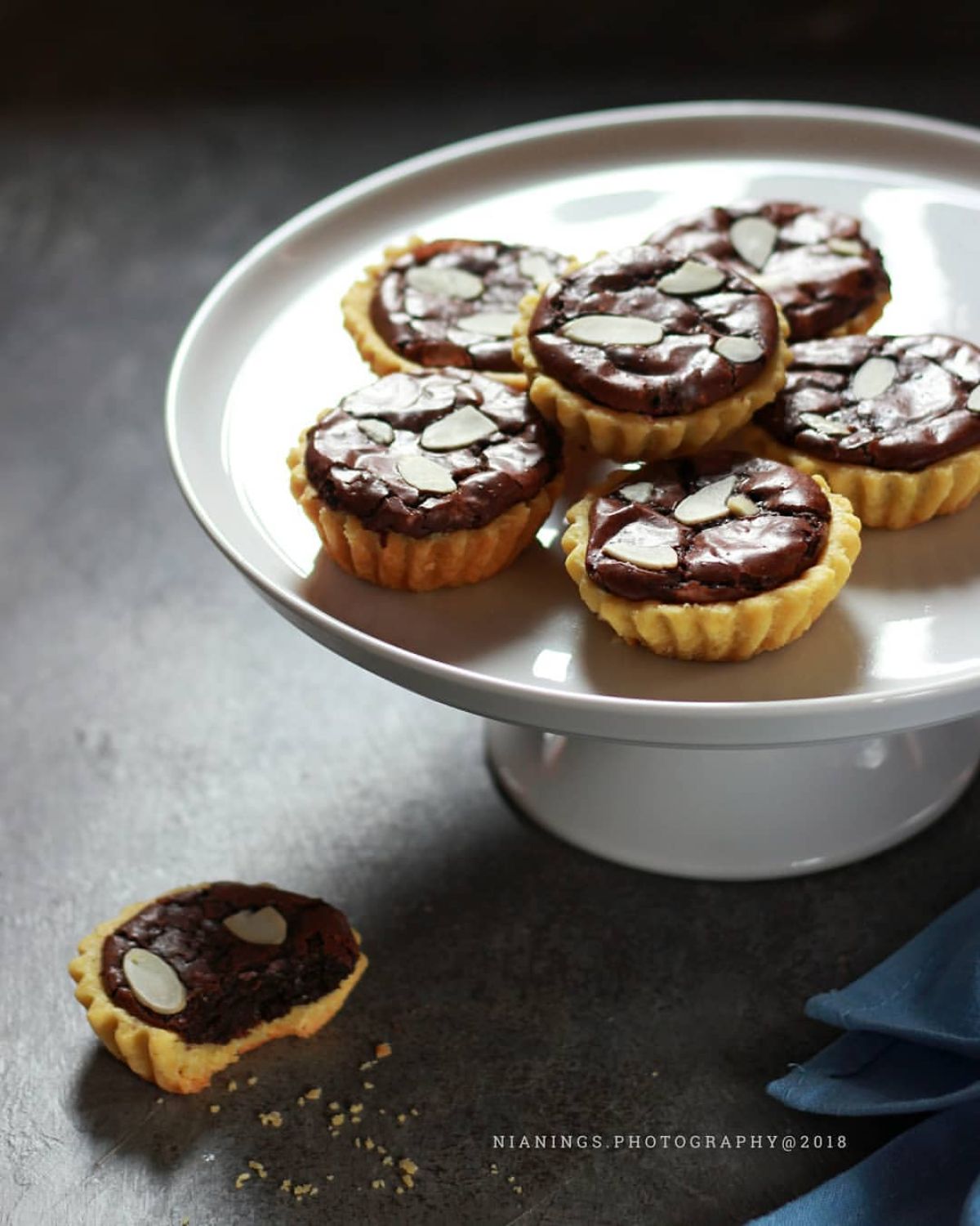 - Panggang Brownies: Tuang adonan brownie ke dalam crust pie yang telah disiapkan, taburi dengan almond iris. Panggang selama kurang lebih 30 menit atau sampai shiny crust muncul. Setelah itu, turunkan suhu oven ke 160°C hingga matang.