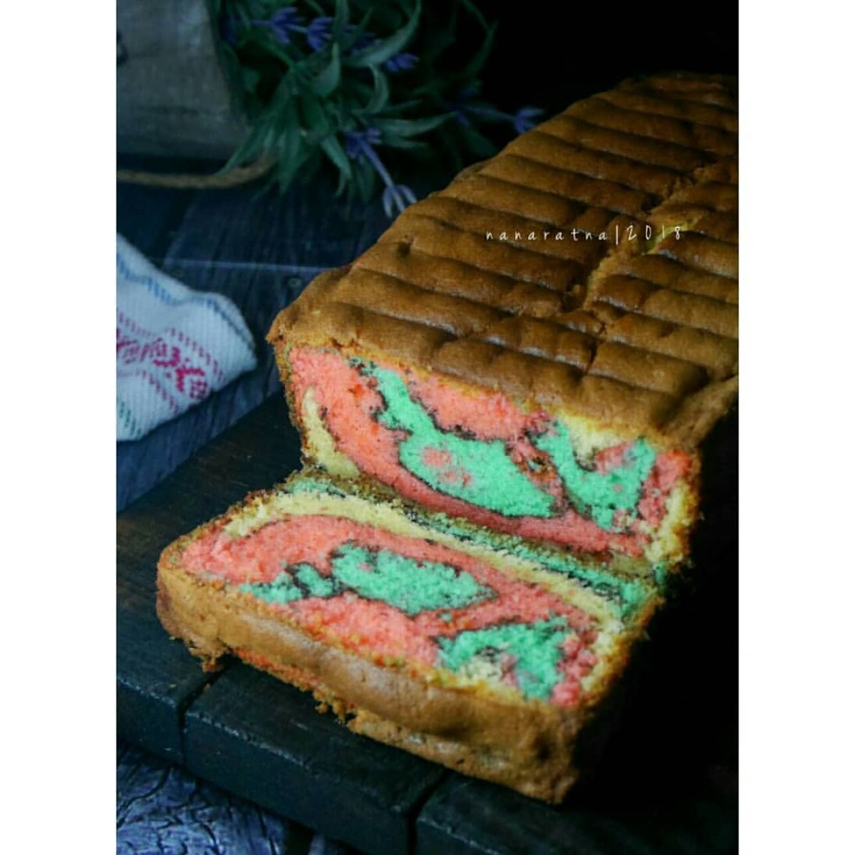 - Masukkan adonan putih dan adonan berwarna secara bergantian ke dalam loyang dan gunakan sendok untuk menciptakan motif marble sesuai selera.
