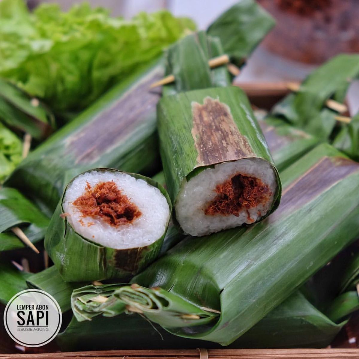 - Ambil selembar daun pisang, letakkan ketan yang sudah matang di atasnya, ratakan. Tambahkan abon sapi di bagian tengahnya, lalu tutup dan rapikan. Bungkus dengan daun dan semat kedua sisinya menggunakan lidi. Jika ingin lebih beraroma, Anda bisa membakar sebentar di atas teflon.