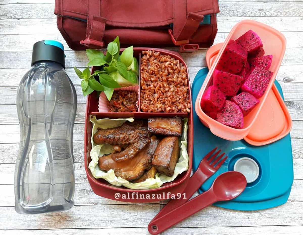 - Hidangan Siap Disajikan: Ambil wadah bekalmu, letakkan nasi merah, ayam tahu bacem, lalapan, sambal, dan irisan buah naga merah di sampingnya. Jangan lupa bawa air mineral, ya!