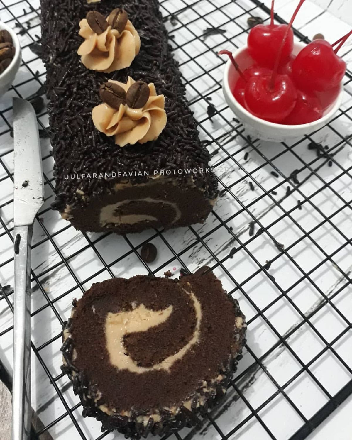 - Setelah agak dingin, oleskan buttercream di atas kue, lalu gulung perlahan sambil dipadatkan. Setelah digulung, oles permukaan kue gulung dengan sisa buttercream dan taburi meises sesuai selera. Hias dengan ceri merah untuk tampilan yang lebih menarik.