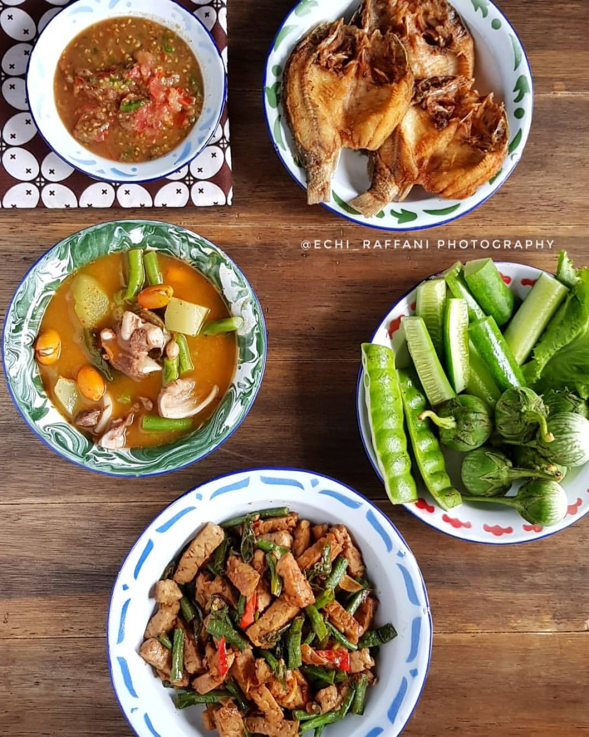 Sajikan sayur asem, ikan mas goreng, tumis tempe, lalapan, dan sambal terasi dalam satu piring. Makanan ini pas banget untuk dihidangkan di pagi hari atau saat makan siang.