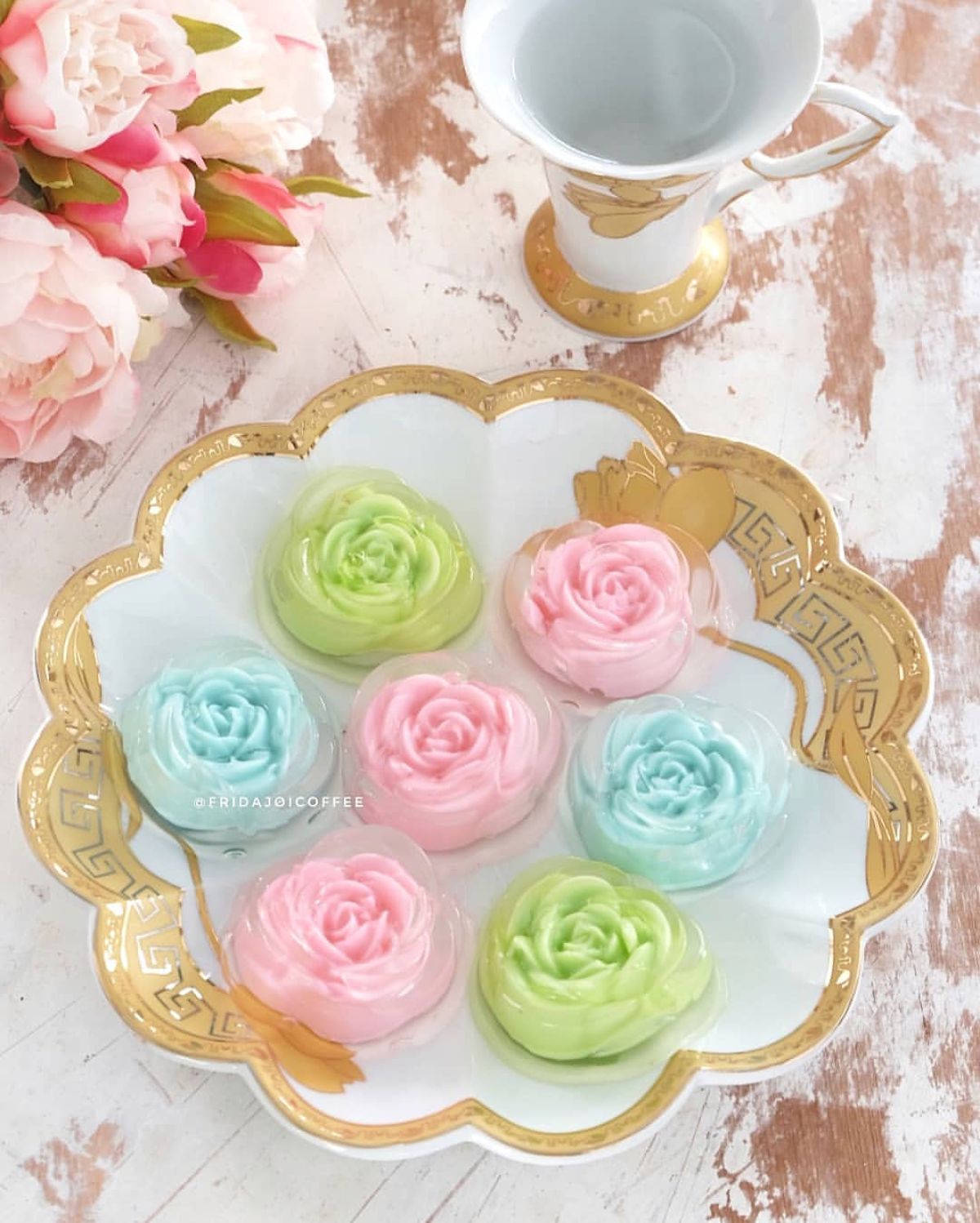 - Pisahkan adonan menjadi beberapa bagian dan beri pewarna makanan sesuai selera. Tuang campuran puding ke dalam cetakan mawar kecil. Biarkan hingga dingin.