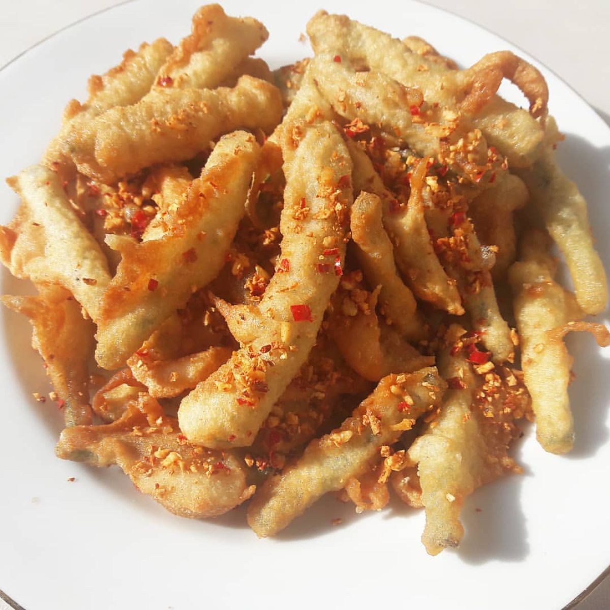 - Goreng buncis dalam minyak yang banyak hingga berwarna kuning keemasan. Angkat dan tiriskan minyaknya.