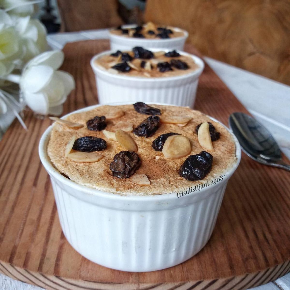 - Tuang adonan ke dalam piring tahan panas (ramekin atau cup aluminium foil). Selanjutnya, tambahkan topping yaitu kocokan putih telur, kismis, dan almond slice di atasnya.