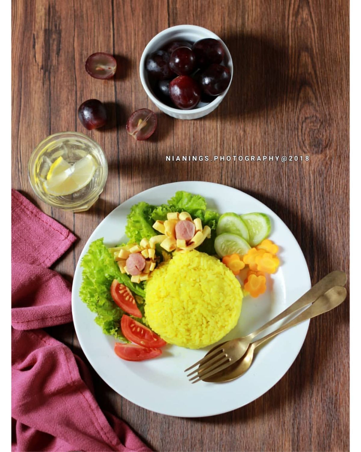 - Penyajian: Ambil piring, letakkan nasi kuning di tengahnya. Tambahkan sosis, wortel parut, irisan timun dan tomat di samping nasi. Lapisi dengan selada.