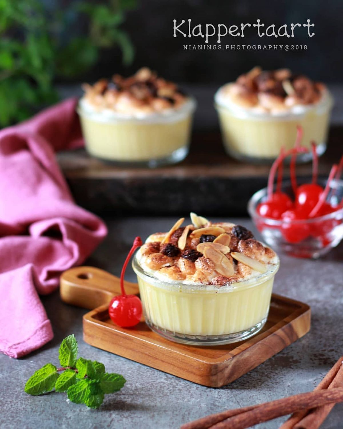 Panggang selama 10 menit, lalu keluarkan dan tambahkan topping busa di atas vla. Taburi dengan kismis, almond slice, dan kayu manis bubuk.