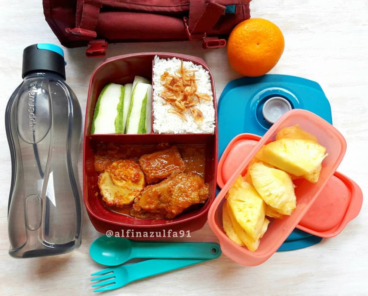 - Menyajikan Bekal: Setelah semua matang, siapkan nasi putih dalam kotak bekal. Tambahkan ayam telor bumbu pedas di sampingnya. Jangan lupa tambahkan irisan timun, jeruk, dan nanas sebagai pelengkap.