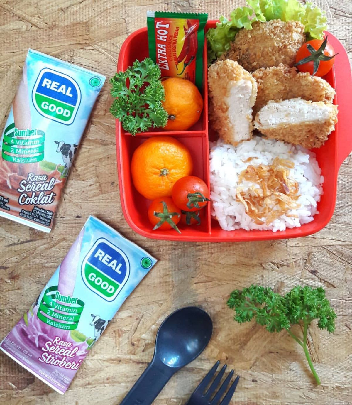 Chicken katsu bisa disajikan dengan nasi, salad, atau sayuran untuk menambah variasi dan nutrisinya. Jangan lupa tambahkan buah dan susu REAL GOOD dengan berbagai rasa untuk bekal yang semakin menarik!
