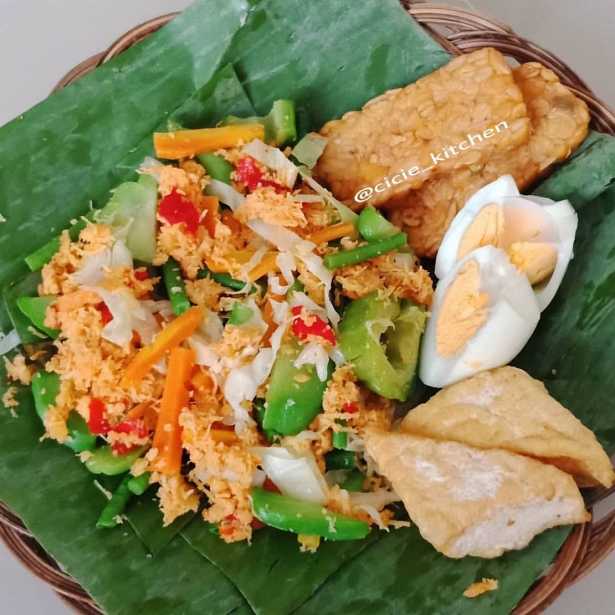 - Siapkan hidangan dengan menata sayuran rebus, tempe, tahu, dan telur rebus di atas piring, lalu tambahkan urapan kelapa di atasnya. Selamat menikmati!