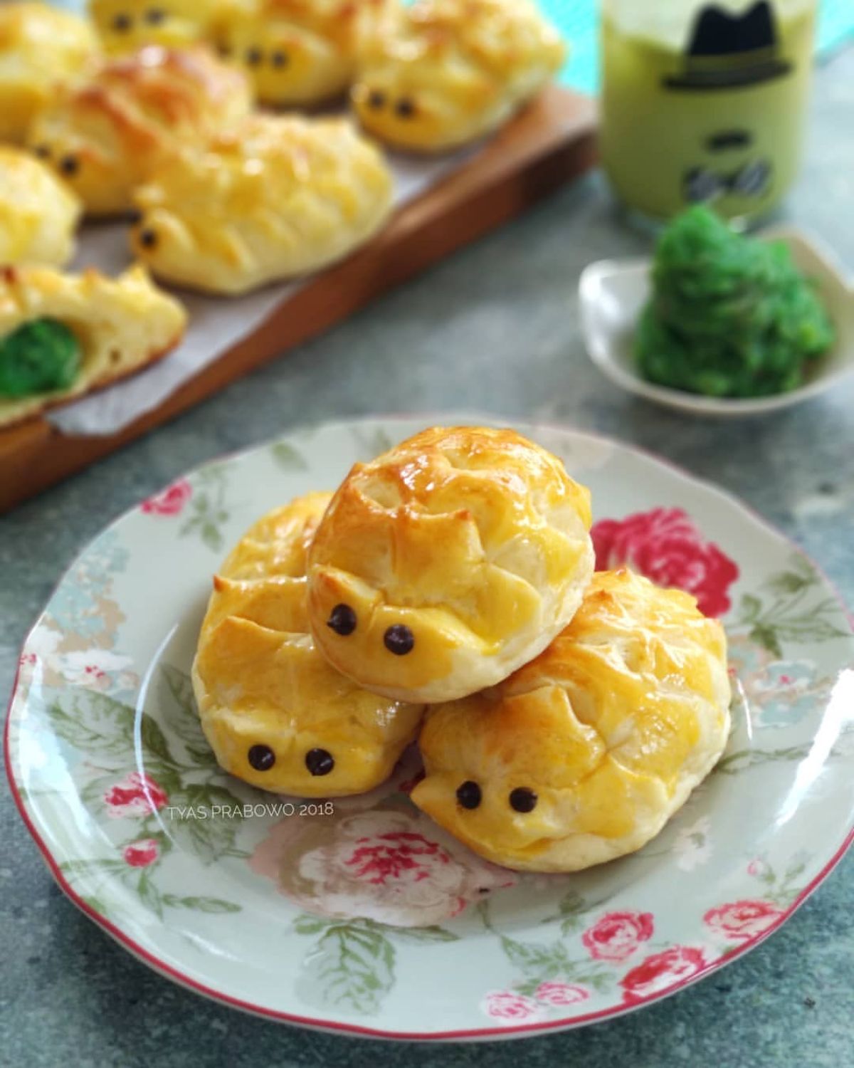 3. Membentuk Roti: Setelah adonan mengembang, Kempiskan adonan dan timbang seberat 40 gr setiap bagian. Bulatkan adonan dan beri isian kumbu pisang di tengahnya. Bentuk adonan menjadi bulat lonjong lalu gunting bagian atasnya supaya menyerupai landak.