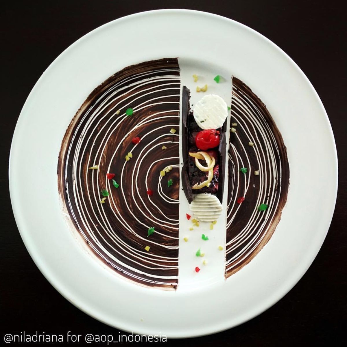 - Potong brownies yang sudah dingin, susun di atas piring. Tambahkan saus coklat di atasnya, letakkan wafer putih di sisi-sisinya, dan hias dengan buah cherry.