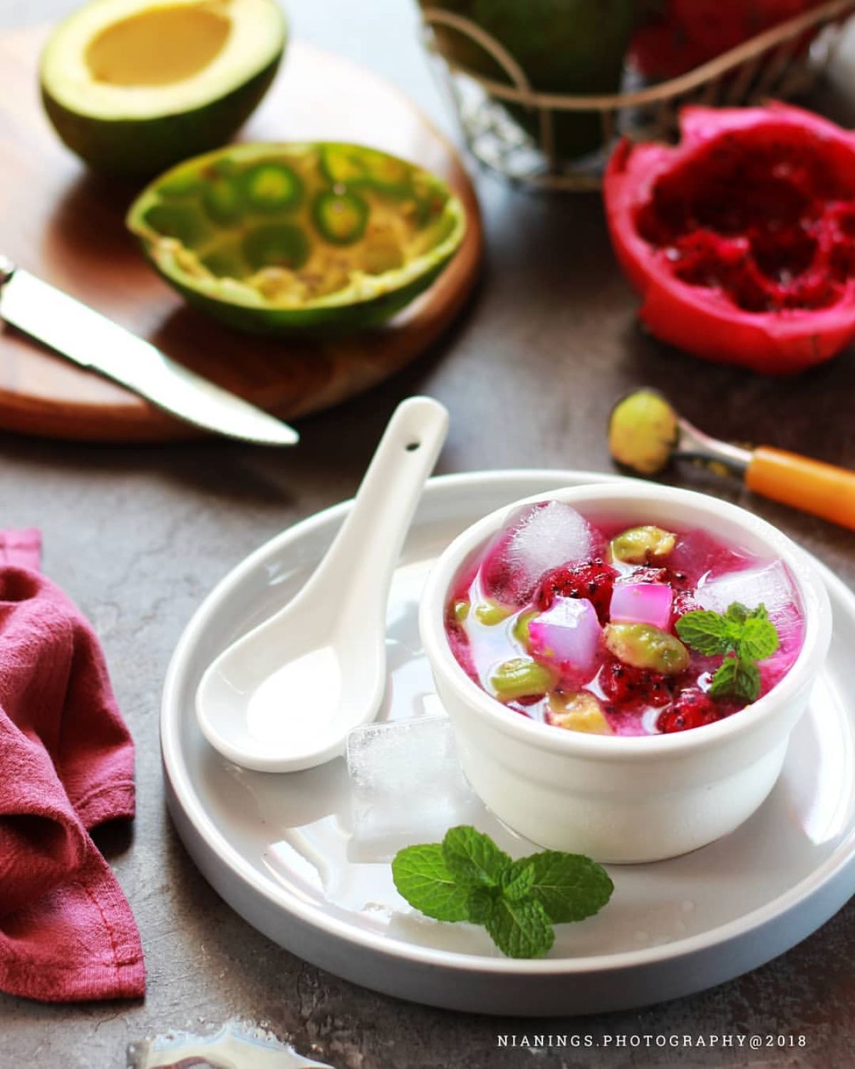 - Dalam mangkok, campurkan potongan buah naga, alpukat, dan nata de coco. Nata de coco adalah makanan penutup yang terbuat dari kelapa, memberikan tekstur kenyal yang unik.