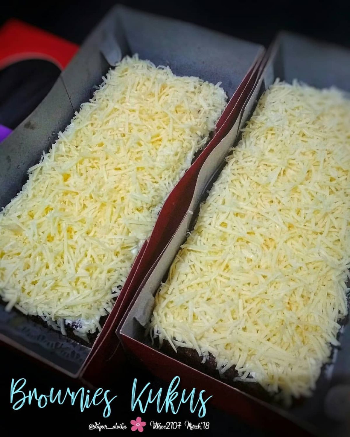 - Taburkan keju parut di atas adonan brownies sebelum dikukus.