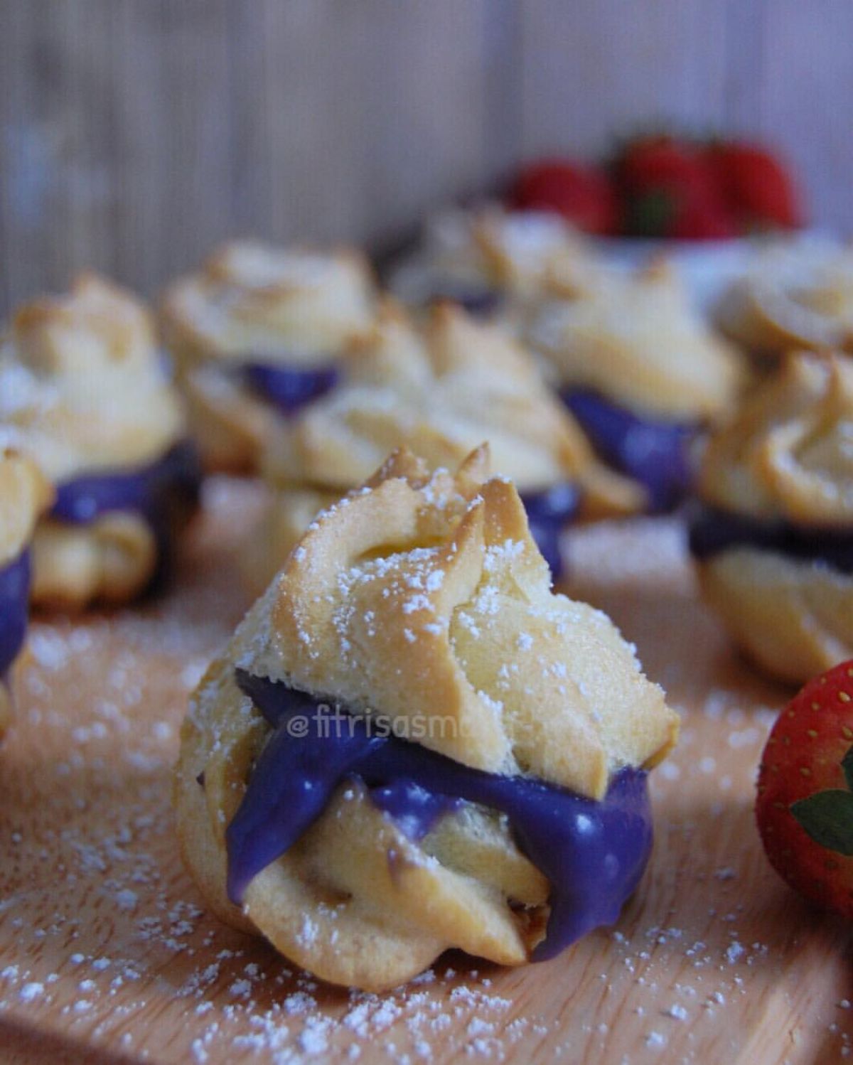 Setelah semua siap, ambil kue sus yang sudah dipanggang. Belah sedikit bagian atasnya, lalu isi dengan vla acai berry. Kue sus siap disajikan! Nikmati kue ini bersama keluarga atau teman-teman.
