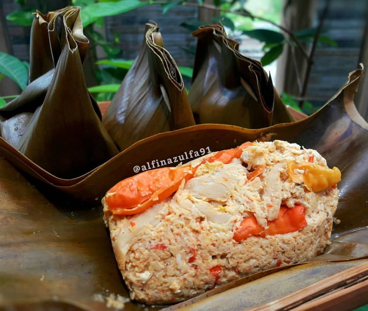 - Setelah semua bahan tercampur rata, ambil selembar daun pisang, lalu adagkan campuran tahu dan jamur. Bungkus dengan rapi dan rapat, gunakan tusuk gigi untuk menahan agar tidak terbuka.
