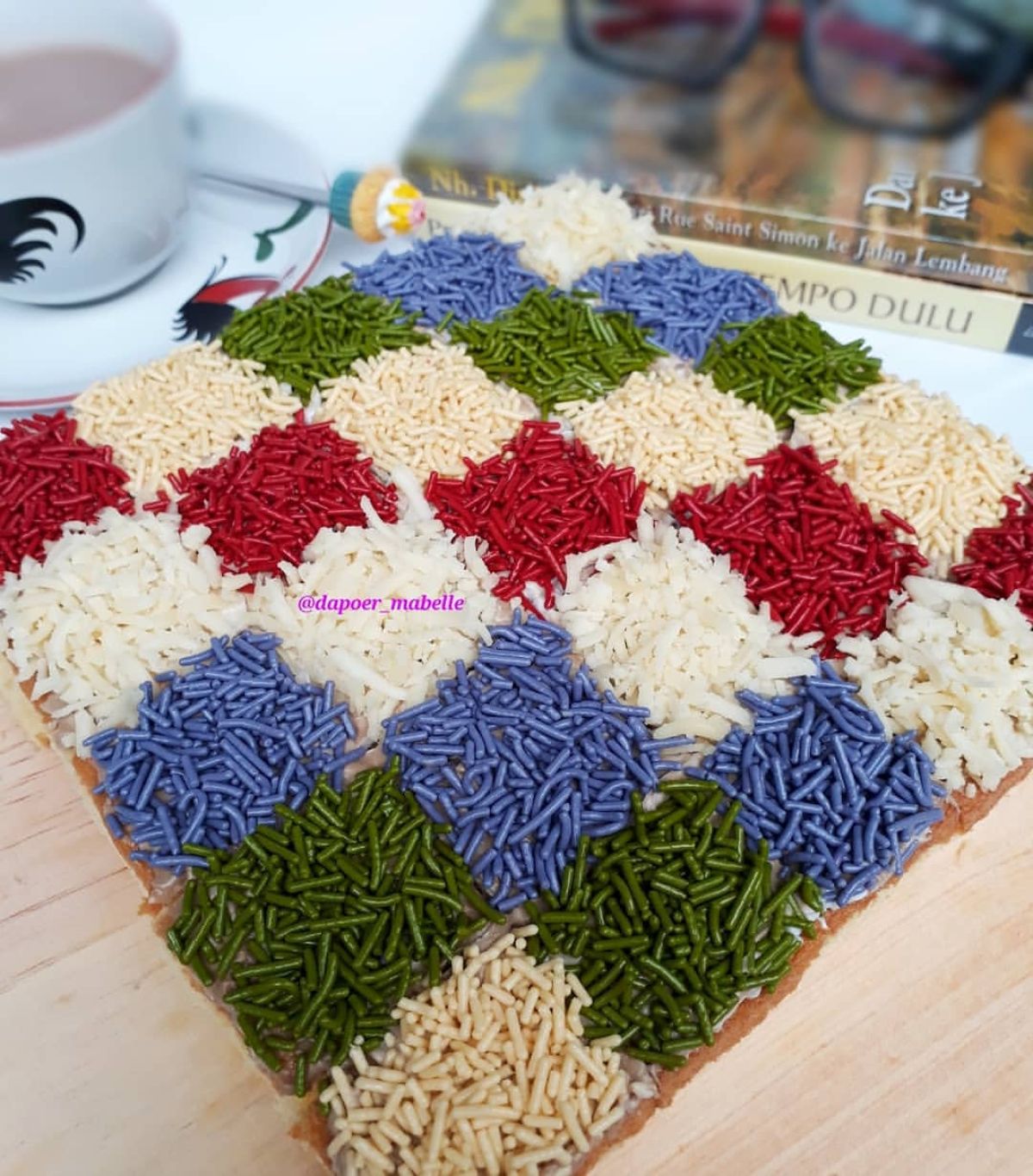 Setelah matang, keluarkan bolu dari oven dan biarkan dingin. Setelah itu, tambahkan topping messes dan keju parut sesuai selera. Potong sesuai keinginan dan sajikan!