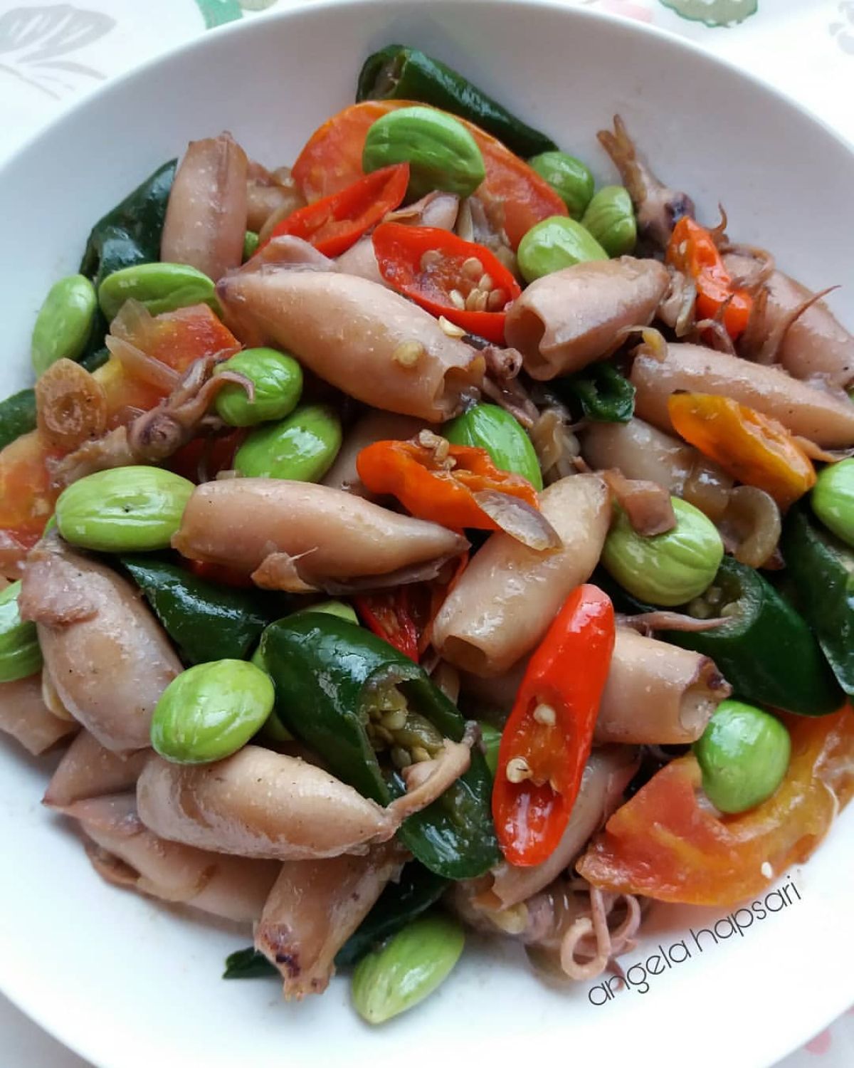 - Masukkan cumi, petai, dan tomat. Aduk rata agar semua bahan tercampur dengan baik.