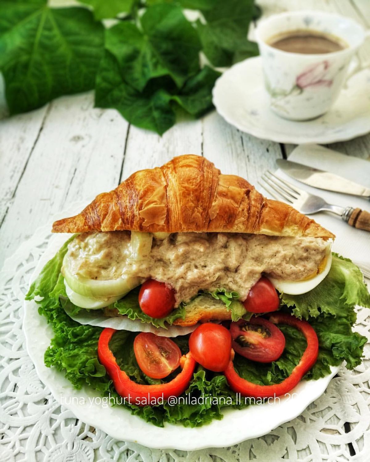 - Ambil croissant yang sudah dibelah. Isi dengan salad tuna yang telah dingin. Untuk pelengkap, bisa menambahkan selada, tomat cherry, telur rebus, dan paprika sesuai selera.