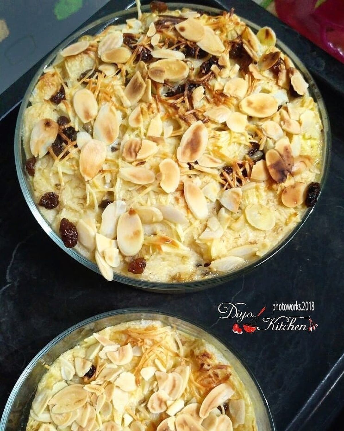 - Susun kembali sisa roti tawar di atasnya, taburi lagi dengan kismis dan keju parut. Tuang sisa campuran susu, dan terakhir taburi dengan almond slice. Diamkan selama 10 menit agar roti menyerap campuran susu dengan baik.