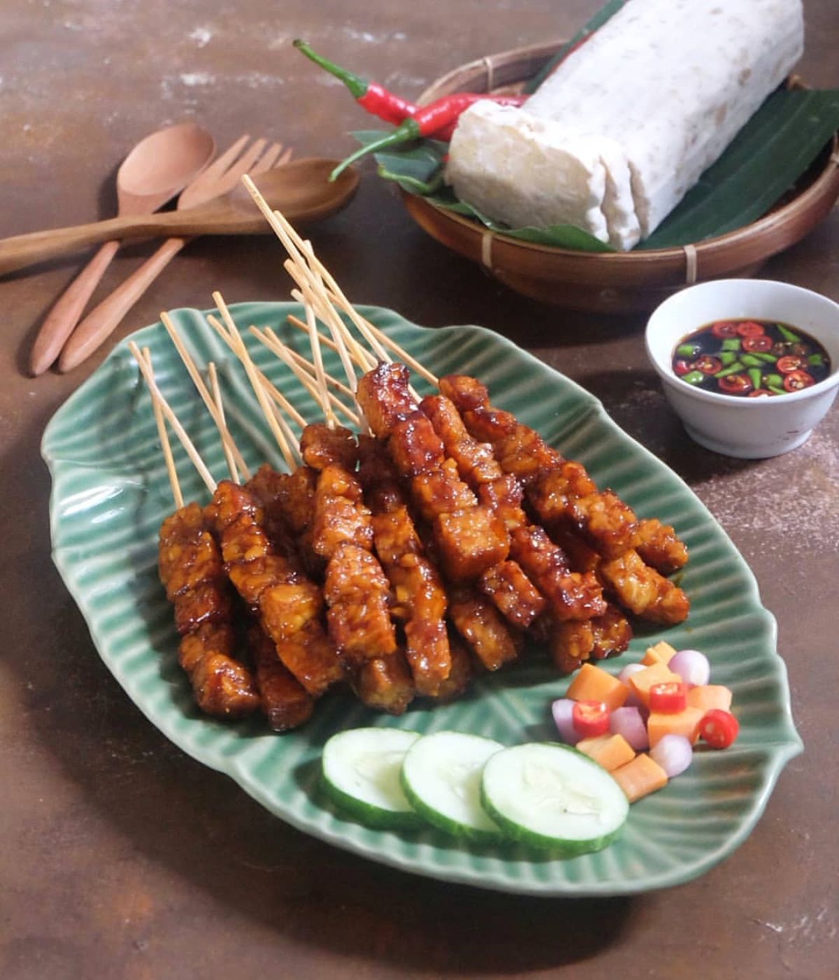 6. Sate Tempe siap disajikan! Nikmati dengan sambal kecap dan acar timun wortel serta bawang merah sebagai pelengkap. Kombinasi ini membuat hidangan semakin menggugah selera.