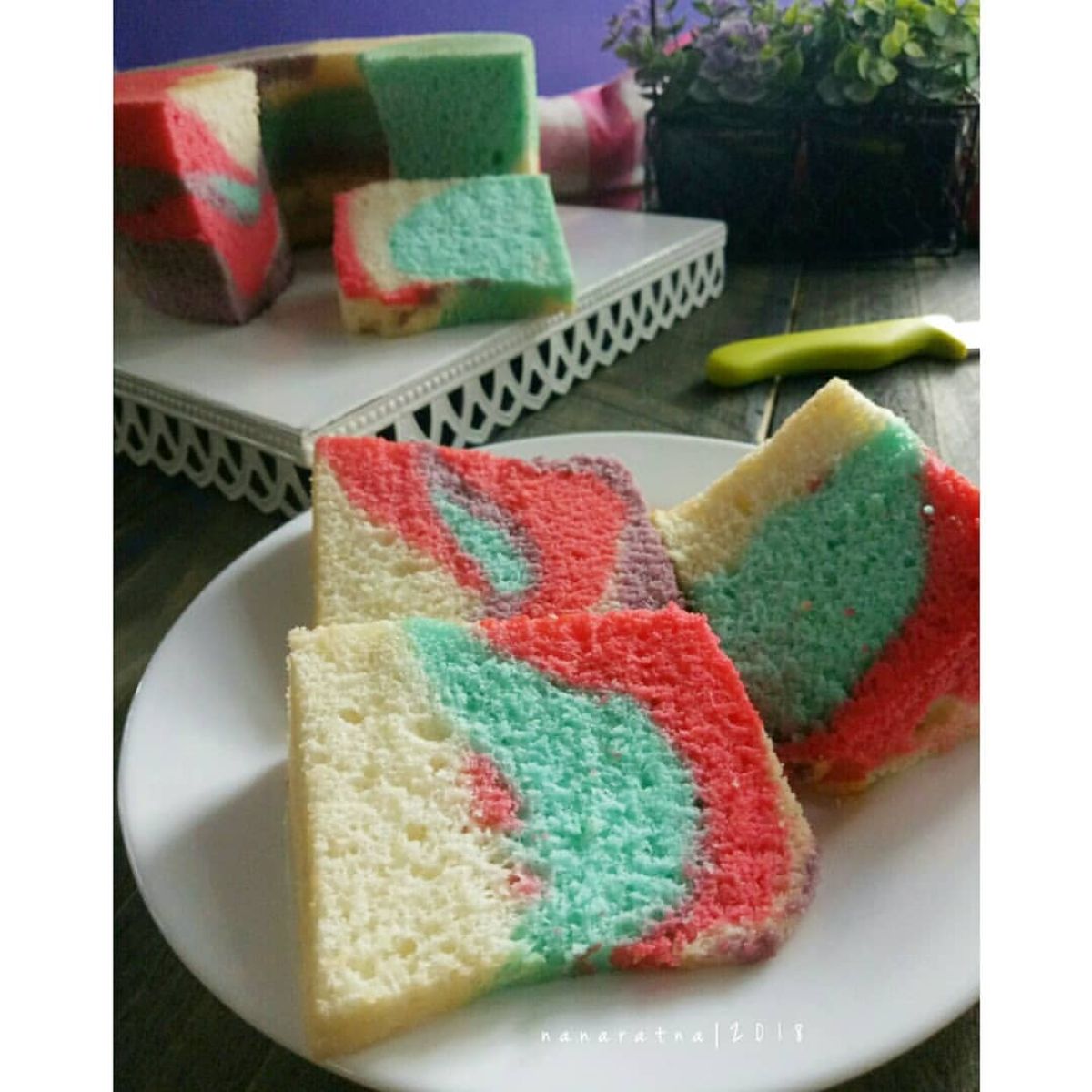 - Bagi adonan menjadi beberapa bagian sesuai warna yang diinginkan. Tuang setiap warna ke dalam loyang chiffon yang tidak dioles margarin.