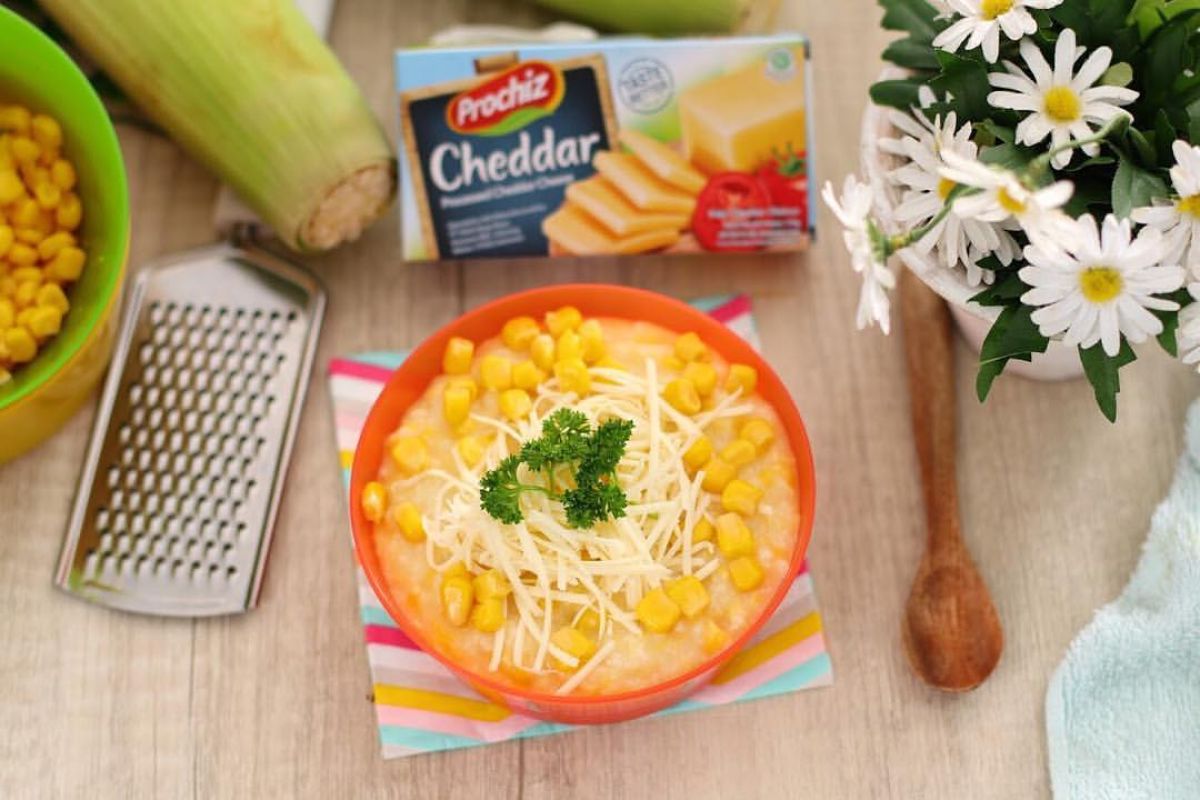 - Setelah bubur matang, masukkan Prochiz Spready dan Prochiz Cheddar yang sudah diparut, bersama dengan jagung manis pipil. Wow, baunya sudah sedap, kan?