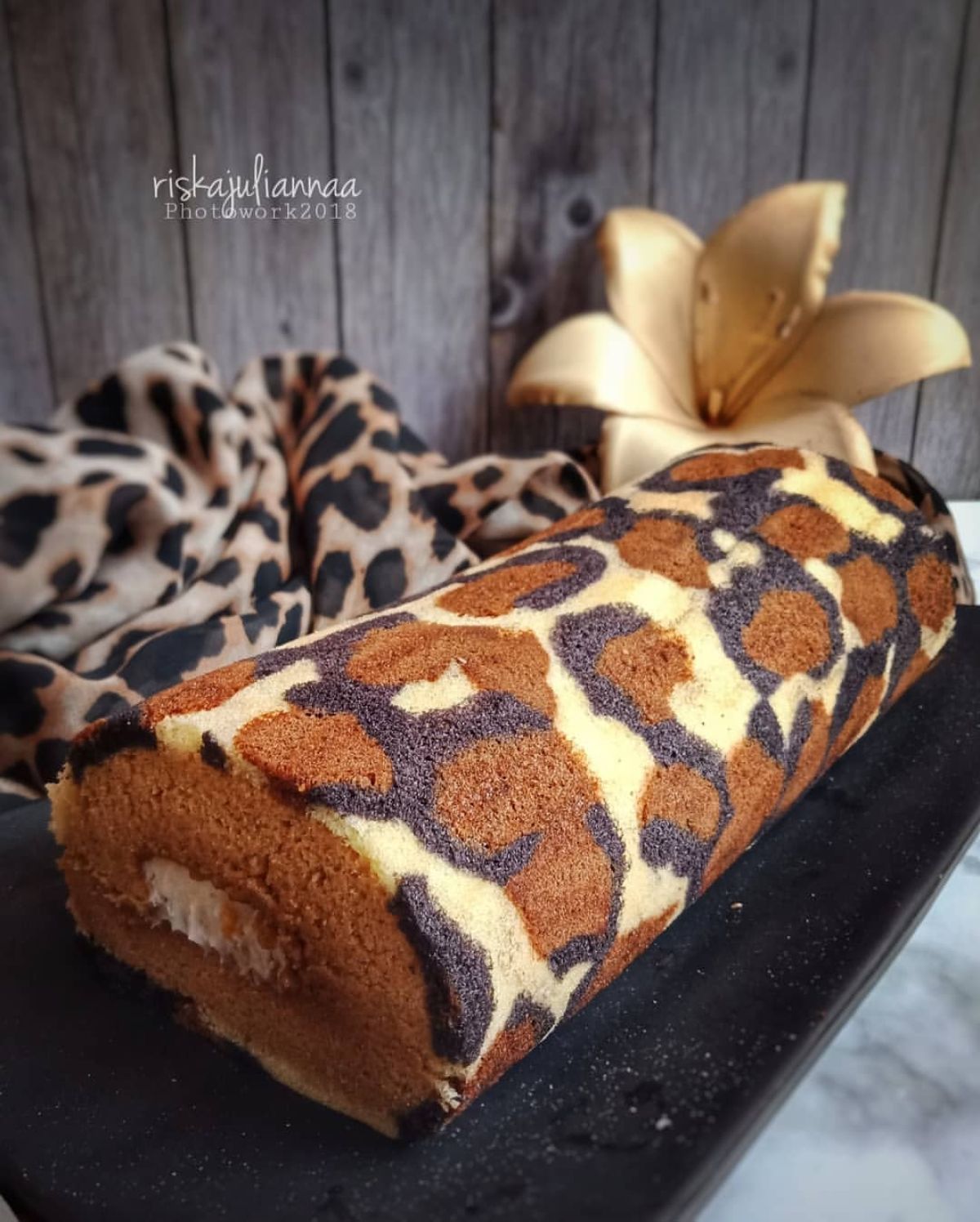 Kue gulung atau roll cake ini memiliki sejarah panjang di berbagai negara. Kue ini sering diisi dengan krim atau selai, menjadikannya makanan penutup yang populer. Motif leopard yang digunakan dalam kue ini menambah daya tarik visual dan memberikan nuansa modern dalam pembuatan kue tradisional. Kue ini sangat cocok disajikan pada perayaan, berkumpul bersama keluarga, atau acara spesial seperti ulang tahun.